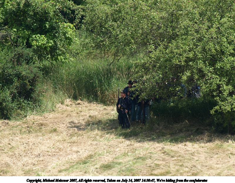 Picture #37: We're hiding from the confederates 800x623, 182,513 bytes (179K), (html file) Copyright, Michael Meissner 2007, All rights reserved Olympus E-510 camera with Olympus 50-200mm f/2.8-3.5 lens and Olympus EC-14 (1.4x) f/5.6, ISO 100, 1/250 sec, 283.0mm, auto mode, natural color, SHQ, matrix metering, -2 sharpening, image stabilization 35mm equivalent focal length 567.0mm, EC-14 Programs used: gimp Taken by Michael Meissner on July 14, 2007 14:30:47 Last modified on July 14, 2007 at 14:30 |