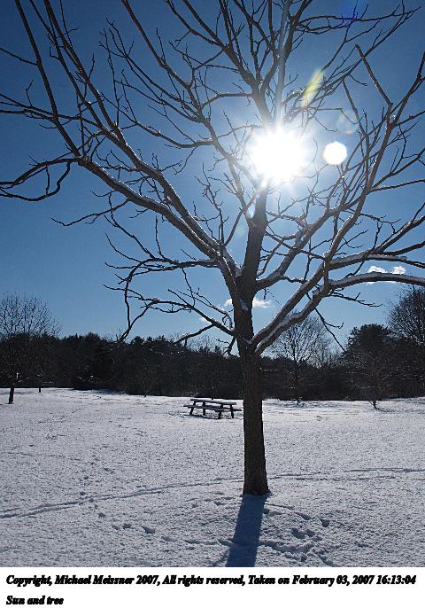 Picture #2: Sun and tree Thumb: 240x320, 43,293 bytes (43K) Small: 480x686, 110,456 bytes (108K), (html file) Copyright, Michael Meissner 2007, All rights reserved Olympus E-1 camera with Olympus 14-54mm f/2.8-3.5 lens f/11.0, ISO 100, 1/640 sec, 14.0mm, auto mode, SHQ, spot metering, +2 sharpening, Exposure bracketing (shot 1) 35mm equivalent focal length 28.0mm Programs used: gimp, rotate Taken by Michael Meissner on February 03, 2007 16:13:04 Last modified on February 03, 2007 at 16:13 The file originally appeared in http://www.the-meissners.org/2007-small-albums/2007-02/index.html. |