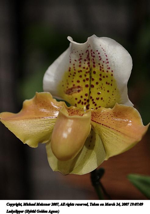 Picture #1: Ladyslipper (Hybtid Golden Agnes) Thumb: 246x328, 32,830 bytes (33K) Small: 492x702, 55,375 bytes (55K), (html file) Copyright, Michael Meissner 2007, All rights reserved Olympus E-1 camera ISO 200, 1/1000 sec, auto mode, SHQ, matrix metering, bias -0.3, +2 sharpening 35mm equivalent focal length 0.0mm Extra equipment used: Olympus 50mm macro lens Programs used: NoiseNinja, RAW, gimp Taken by Michael Meissner on March 24, 2007 19:07:09 Last modified on March 27, 2007 at 00:54 The file originally appeared in http://www.the-meissners.org/2007-small-albums/2007-flowershow/index.html. |