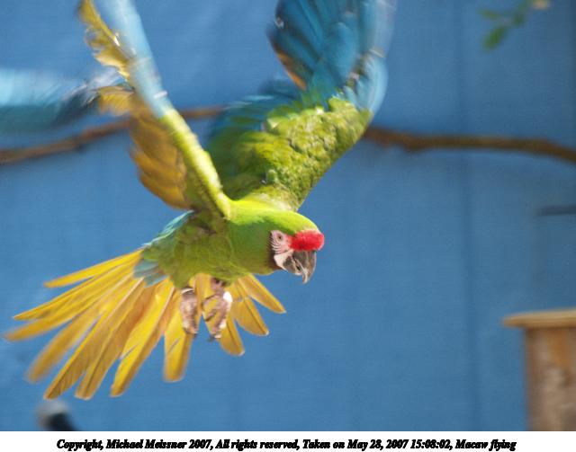 Picture #1: Macaw flying Thumb: 320x240, 21,655 bytes (22K) Small: 640x503, 42,785 bytes (42K), (html file) Copyright, Michael Meissner 2007, All rights reserved Olympus E-1 camera with Olympus 50-200mm f/2.8-3.5 lens and Olympus EC-14 (1.4x) f/5.0, ISO 200, 1/200 sec, 283.0mm, auto mode, SHQ, matrix metering, +2 sharpening, continous focus 35mm equivalent focal length 567.0mm, EC-14 Taken by Michael Meissner on May 28, 2007 15:08:02 Last modified on May 28, 2007 at 15:08 The file originally appeared in http://www.the-meissners.org/2007-small-albums/2007-stonezoo/index.html. |
