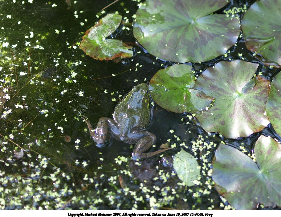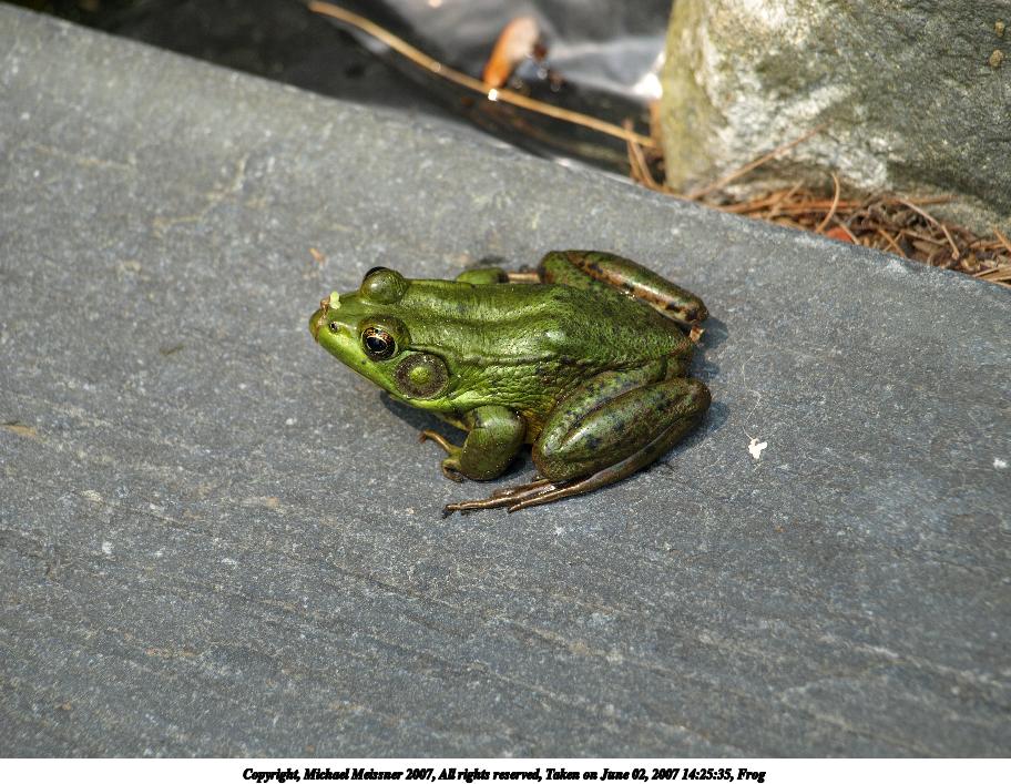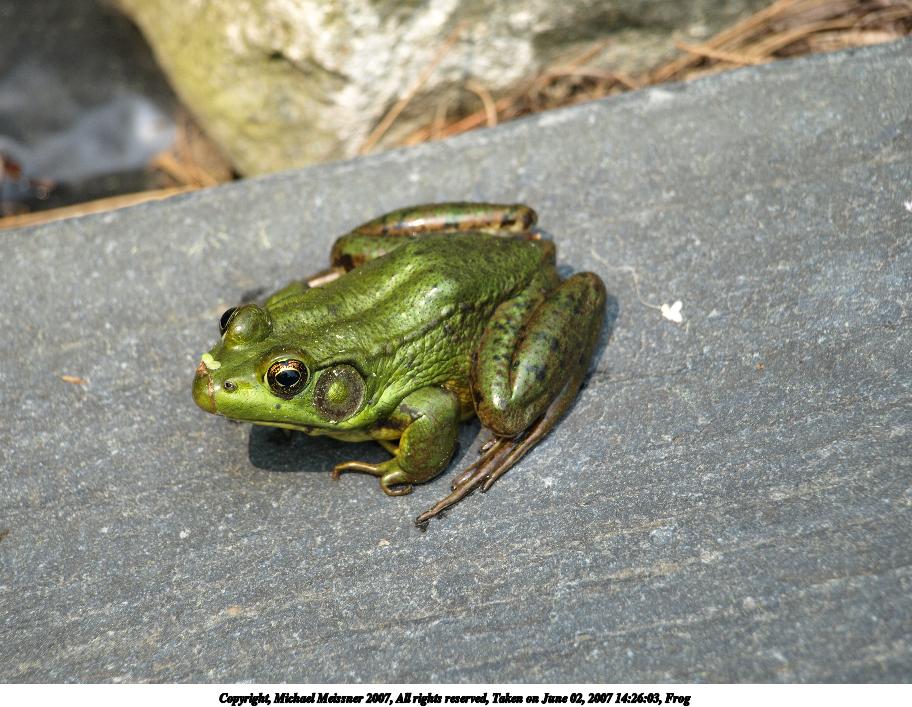 Picture #2: Frog #2 Thumb: 456x342, 46,556 bytes (46K) Small: 912x707, 136,610 bytes (134K), (html file) Copyright, Michael Meissner 2007, All rights reserved Olympus E-510 camera with Olympus 40-150mm f/4.0-5.6 lens f/5.6, ISO 100, 1/160 sec, 150.0mm, auto mode, natural color, SHQ, matrix metering, image stabilization, noise filter low 35mm equivalent focal length 301.0mm Taken by Michael Meissner on June 02, 2007 14:26:03 Last modified on June 02, 2007 at 14:26 The file originally appeared in http://www.the-meissners.org/2007-small-albums/2007-nanag/index.html. |