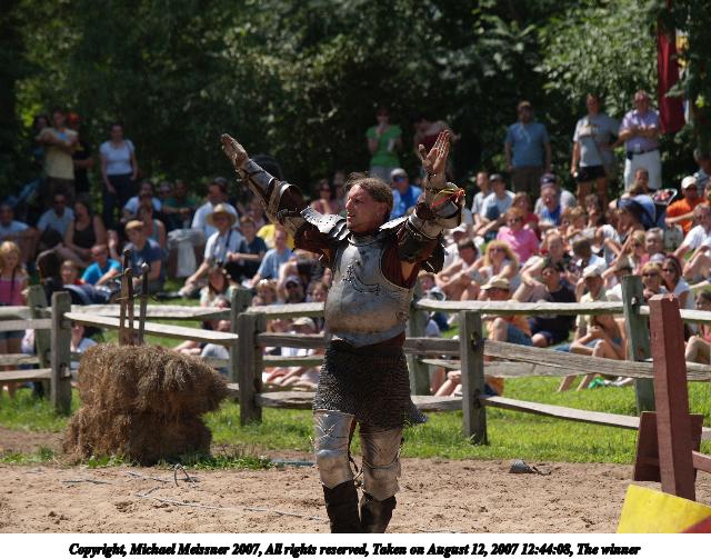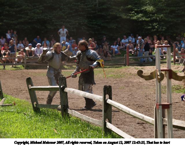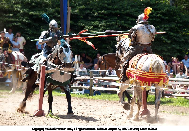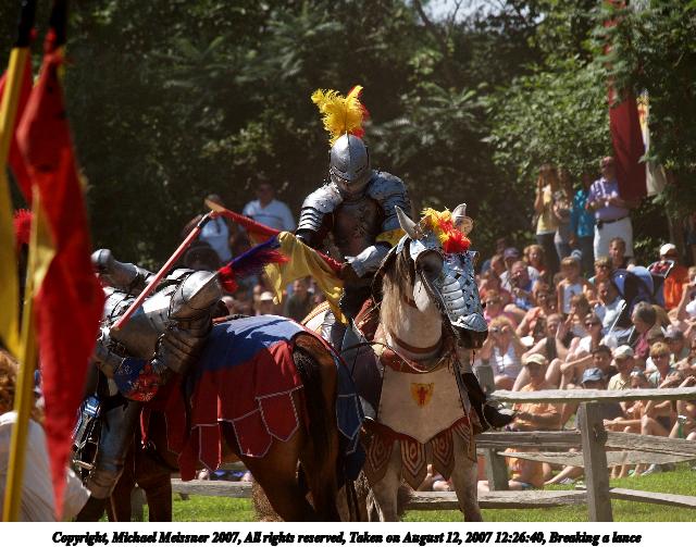 Picture #2: Breaking a lance Thumb: 320x240, 36,044 bytes (36K) Small: 640x503, 81,610 bytes (80K), (html file) Copyright, Michael Meissner 2007, All rights reserved Olympus E-1 camera with Olympus 50-200mm f/2.8-3.5 lens f/5.0, ISO 100, 1/400 sec, 158.0mm, auto mode, SHQ, center weight metering, +2 sharpening 35mm equivalent focal length 317.0mm Programs used: gimp Taken by Michael Meissner on August 12, 2007 12:26:40 Last modified on August 12, 2007 at 12:26 The file originally appeared in http://www.the-meissners.org/2007-small-albums/2007-sterling/index.html. |
