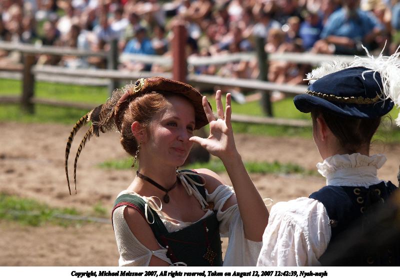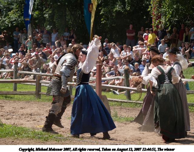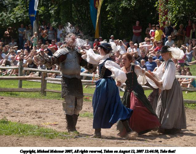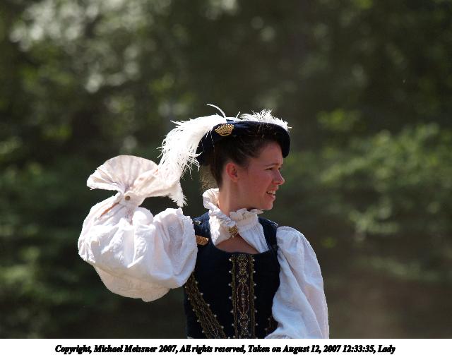 Picture #6: Knight and lady Thumb: 400x300, 33,982 bytes (34K) Small: 800x623, 76,132 bytes (75K), (html file) Copyright, Michael Meissner 2007, All rights reserved Olympus E-1 camera with Olympus 50-200mm f/2.8-3.5 lens f/4.5, ISO 100, 1/320 sec, 200.0mm, auto mode, SHQ, center weight metering, +2 sharpening, continous focus 35mm equivalent focal length 401.0mm Programs used: gimp Taken by Michael Meissner on August 12, 2007 12:39:27 Last modified on August 12, 2007 at 12:39 The file originally appeared in http://www.the-meissners.org/2007-small-albums/2007-sterling/index.html. |