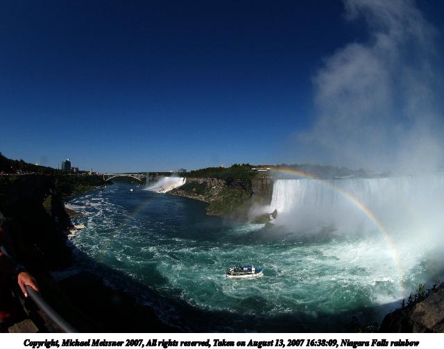 Picture #1: Niagara Falls rainbow Thumb: 320x240, 19,028 bytes (19K) Small: 640x503, 43,965 bytes (43K), (html file) Copyright, Michael Meissner 2007, All rights reserved Olympus E-1 camera with Olympus 7-14mm f/4.0 lens f/11.0, ISO 100, 1/500 sec, 8.0mm, auto mode, SHQ, matrix metering, bias -0.7, +2 sharpening, Exposure bracketing (shot 3) 35mm equivalent focal length 16.0mm Taken by Michael Meissner on August 13, 2007 16:33:16 Last modified on August 13, 2007 at 16:33 The file originally appeared in http://www.the-meissners.org/2007-small-albums/2007-niagara/index.html. |