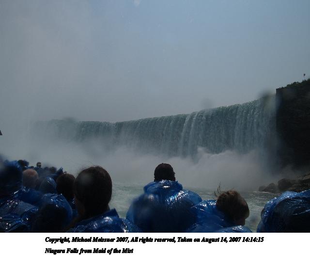 Picture #3: Niagara Falls from Maid of the Mist Thumb: 320x240, 22,886 bytes (23K) Small: 640x526, 38,571 bytes (38K), (html file) Copyright, Michael Meissner 2007, All rights reserved Olympus E-1 camera with Olympus 14-54mm f/2.8-3.5 lens f/7.1, ISO 100, 1/400 sec, 41.0mm, auto mode, SHQ, matrix metering, +2 sharpening 35mm equivalent focal length 82.0mm Programs used: NoiseNinja, gimp Taken by Michael Meissner on August 14, 2007 14:09:30 Last modified on August 14, 2007 at 14:09 The file originally appeared in http://www.the-meissners.org/2007-small-albums/2007-niagara/index.html. |