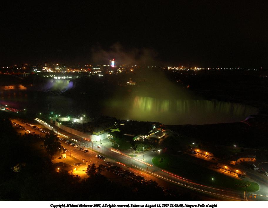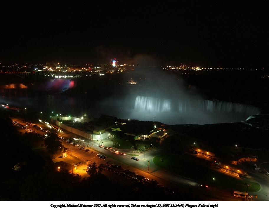 Picture #6: Niagara Falls at night Thumb: 456x342, 29,448 bytes (29K) Small: 912x707, 70,607 bytes (69K), (html file) Copyright, Michael Meissner 2007, All rights reserved Olympus E-510 camera with Olympus 14-54mm f/2.8-3.5 lens f/2.8, ISO 100, 1.3 sec, 14.0mm, auto mode, natural color, SHQ, spot metering, image stabilization, noise filter low 35mm equivalent focal length 28.0mm Extra equipment used: tripod Taken by Michael Meissner on August 15, 2007 21:54:43 Last modified on August 15, 2007 at 21:54 The file originally appeared in http://www.the-meissners.org/2007-small-albums/2007-niagara/index.html. |