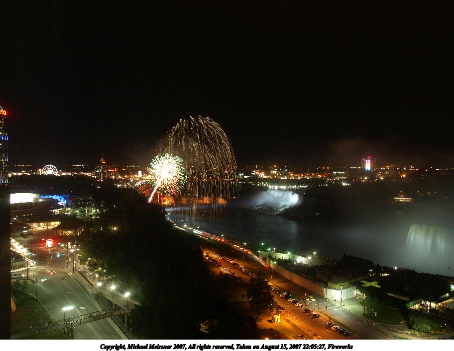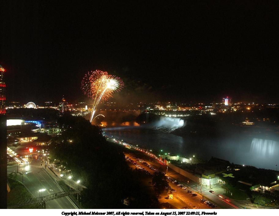 Picture #3: Fireworks #3 Thumb: 456x342, 33,048 bytes (33K) Small: 912x707, 93,760 bytes (92K), (html file) Copyright, Michael Meissner 2007, All rights reserved Olympus E-510 camera with Olympus 14-54mm f/2.8-3.5 lens f/4.0, ISO 100, 3.5 sec, 14.0mm, manual mode, natural color, SHQ, matrix metering, noise reduction, noise filter low 35mm equivalent focal length 28.0mm Extra equipment used: tripod Taken by Michael Meissner on August 15, 2007 22:09:21 Last modified on August 15, 2007 at 22:09 The file originally appeared in http://www.the-meissners.org/2007-small-albums/2007-niagara/index.html. |