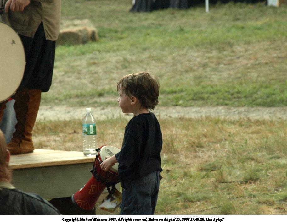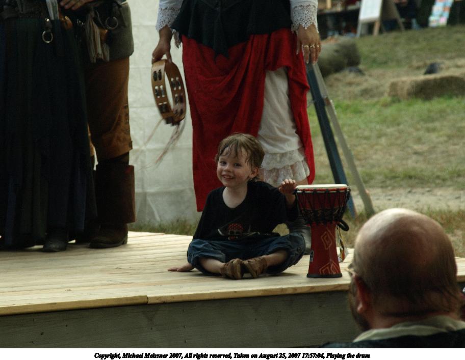 Picture #3: Playing the drum Thumb: 456x342, 50,522 bytes (50K) Small: 912x707, 133,017 bytes (130K), (html file) Copyright, Michael Meissner 2007, All rights reserved Olympus E-510 camera with Sigma 18-125mm f/3.5-5.6 lens f/8.0, ISO 400, 1/50 sec, 87.0mm, aperture priority, natural color, SHQ, cloudy (6000K), matrix metering, auto + manual focus, image stabilization, noise filter low 35mm equivalent focal length 174.0mm Programs used: gimp Taken by Michael Meissner on August 25, 2007 17:49:18 Last modified on September 08, 2007 at 09:45 The file originally appeared in http://www.the-meissners.org/2007-small-albums/2007-grafton/index.html. |
