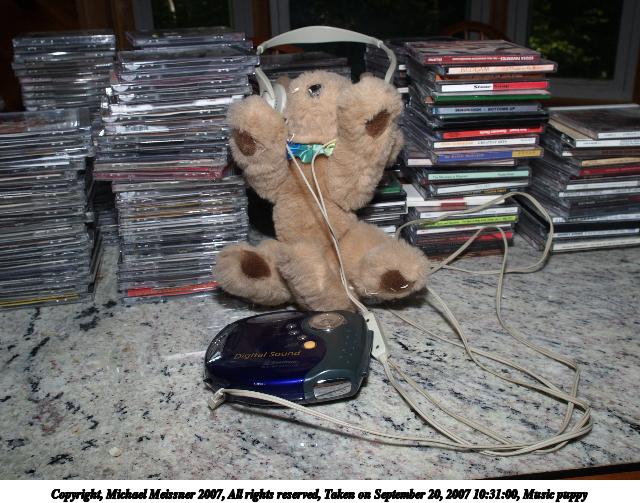Picture #3: Music puppy Thumb: 320x240, 31,422 bytes (31K) Small: 640x503, 85,051 bytes (84K), (html file) Copyright, Michael Meissner 2007, All rights reserved Olympus E-1 camera with Olympus 14-54mm f/2.8-3.5 lens f/8.0, ISO 100, FL-50 flash, 1/40 sec, 19.0mm, aperture priority, SHQ, matrix metering, +2 sharpening 35mm equivalent focal length 38.0mm Extra equipment used: FL-50 flash Taken by Michael Meissner on September 20, 2007 10:31:00 Last modified on September 20, 2007 at 10:31 The file originally appeared in http://www.the-meissners.org/2007-small-albums/2007-09/index.html. |