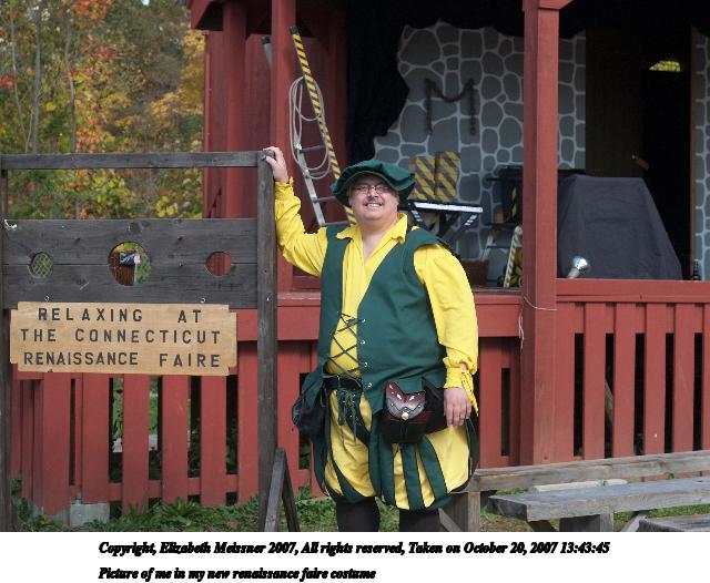 Picture #1: Picture of me in my new renaissance faire costume Thumb: 320x240, 33,265 bytes (33K) Small: 640x526, 73,497 bytes (72K), (html file) Copyright, Elizabeth Meissner 2007, All rights reserved Olympus E-1 camera with Olympus 14-54mm f/2.8-3.5 lens f/5.0, ISO 100, 1/200 sec, 41.0mm, auto mode, SHQ, center weight metering, +2 sharpening 35mm equivalent focal length 82.0mm Programs used: gimp Taken by Elizabeth Meissner on October 20, 2007 13:43:45 Last modified on October 20, 2007 at 13:43 The file originally appeared in http://www.the-meissners.org/2007-small-albums/2007-11/index.html. |