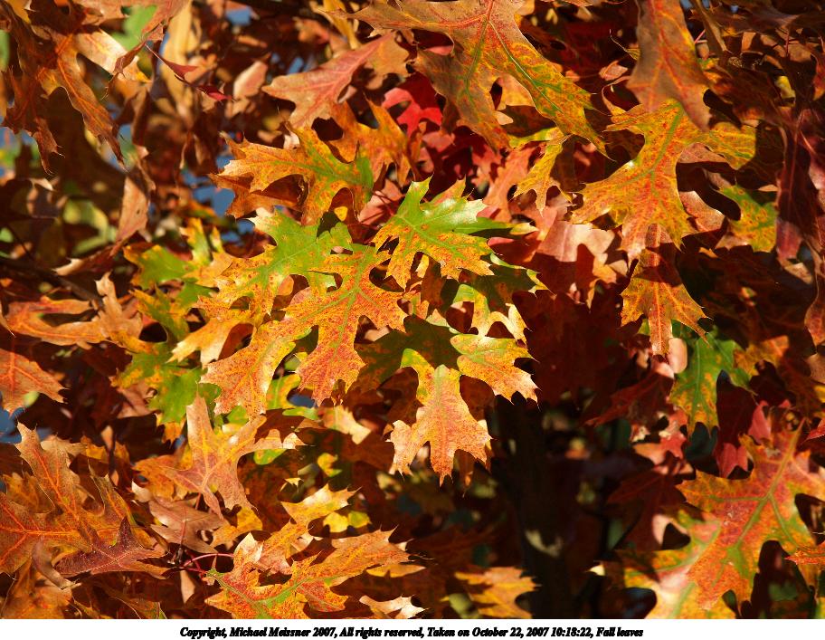 Picture #1: Fall leaves Thumb: 320x240, 27,615 bytes (27K) Small: 640x503, 67,862 bytes (67K), (html file) Copyright, Michael Meissner 2007, All rights reserved Olympus E-1 camera with Olympus 14-54mm f/2.8-3.5 lens f/4.5, ISO 100, 1/125 sec, 29.0mm, auto mode, SHQ, matrix metering, +2 sharpening 35mm equivalent focal length 58.0mm Extra equipment used: polarizer Taken by Michael Meissner on September 23, 2007 16:07:52 Last modified on September 23, 2007 at 16:07 The file originally appeared in http://www.the-meissners.org/2007-small-albums/2007-09/index.html. |