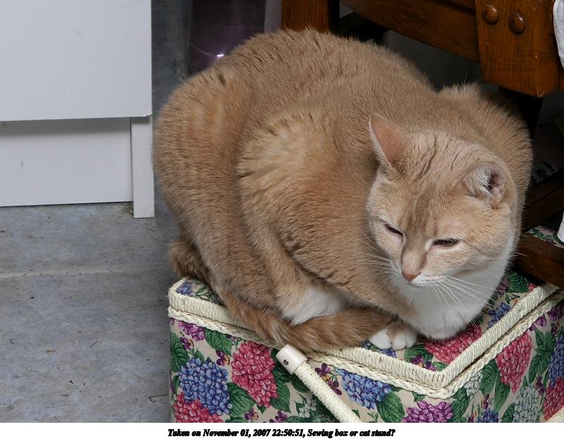 Picture #6: Sewing box or cat stand? Thumb: 400x300, 31,360 bytes (31K) Small: 800x623, 92,145 bytes (90K), (html file) Olympus C-8080WZ camera f/3.2, ISO 50, 1/100 sec, 27.1mm, auto mode, SHQ, matrix metering 35mm equivalent focal length 107.0mm Extra equipment used: FL-50 Programs used: gimp Taken by Michael Meissner on November 01, 2007 22:50:51 Last modified on November 01, 2007 at 22:50 The file originally appeared in http://www.the-meissners.org/2007-small-albums/2007-11/index.html. |