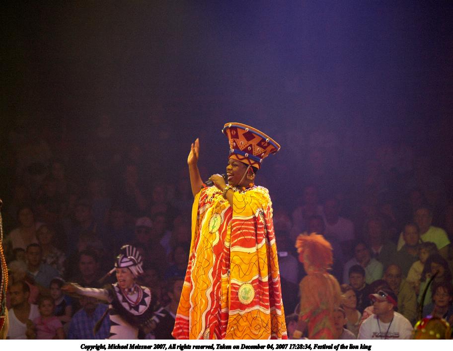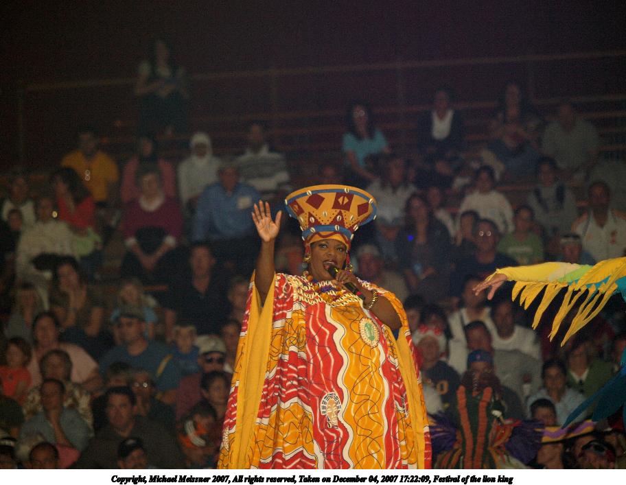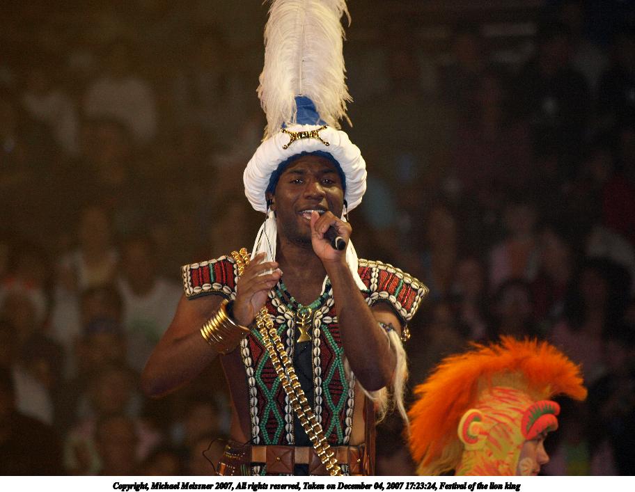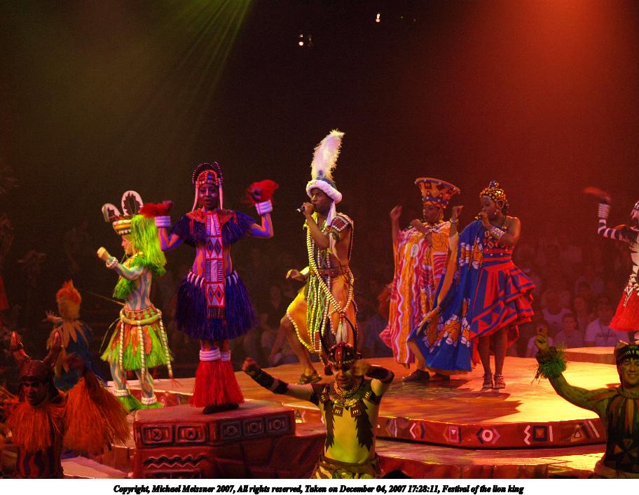 Picture #5: Festival of the lion king #4 Thumb: 456x342, 41,596 bytes (41K) Small: 912x707, 107,619 bytes (106K), (html file) Copyright, Michael Meissner 2007, All rights reserved Olympus E-510 camera with Olympus 50-200mm f/2.8-3.5 lens f/2.8, ISO 800, 1/80 sec, 64.0mm, auto mode, natural color, SHQ, matrix metering, -1 sharpening, image stabilization, noise filter low 35mm equivalent focal length 128.0mm Taken by Michael Meissner on December 04, 2007 17:28:11 Last modified on December 04, 2007 at 16:28 The file originally appeared in http://www.the-meissners.org/2007-small-albums/2007-wdw-animal-park/index.html. |