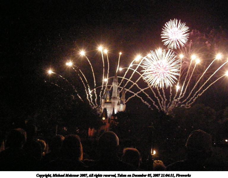 Picture #3: Fireworks #3 Thumb: 384x288, 27,152 bytes (27K) Small: 768x599, 82,550 bytes (81K), (html file) Copyright, Michael Meissner 2007, All rights reserved Olympus SP-550UZ camera f/3.3, ISO 400, 1/80 sec, 7.8mm, auto mode, HQ, matrix metering 35mm equivalent focal length 47.0mm Extra equipment used: handheld Taken by Michael Meissner on December 05, 2007 21:12:35 Last modified on December 05, 2007 at 20:12 The file originally appeared in http://www.the-meissners.org/2007-small-albums/2007-wdw-mk/index.html. |