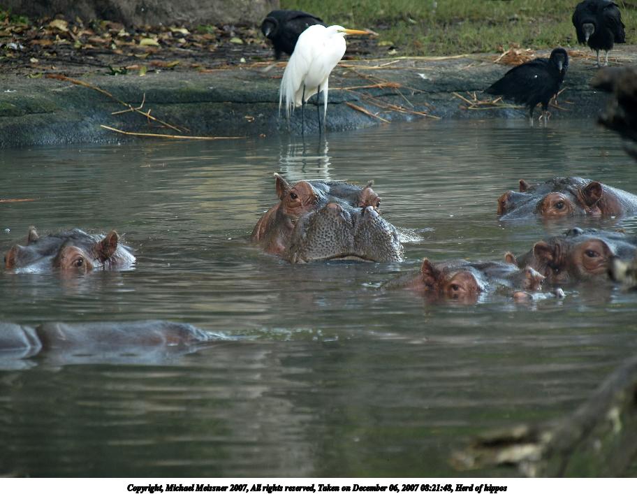 Picture #1: Herd of hippos Thumb: 456x342, 44,161 bytes (44K) Small: 912x707, 107,579 bytes (106K), (html file) Copyright, Michael Meissner 2007, All rights reserved Olympus E-510 camera with Olympus 50-200mm f/2.8-3.5 lens and Olympus EC-14 (1.4x) f/4.8, ISO 400, 1/60 sec, 258.0mm, auto mode, natural color, SHQ, matrix metering, -1 sharpening, image stabilization, noise filter low 35mm equivalent focal length 517.0mm, EC-14 Programs used: gimp, neatimage Taken by Michael Meissner on December 06, 2007 08:21:48 Last modified on December 06, 2007 at 07:21 The file originally appeared in http://www.the-meissners.org/2007-small-albums/2007-wdw-animal-park/index.html. |