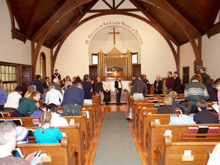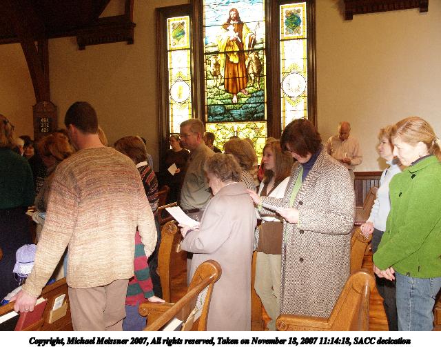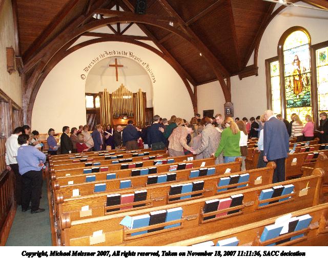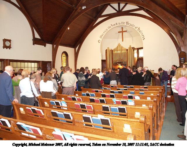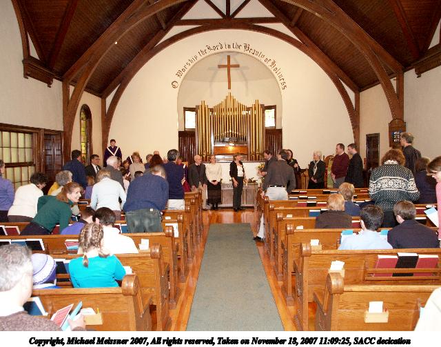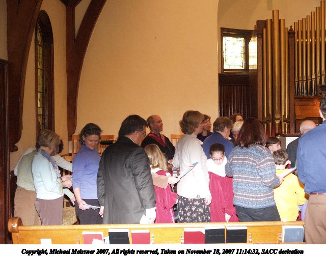Picture #3: SACC decication #3 Thumb: 320x240, 41,878 bytes (41K) Small: 640x503, 92,730 bytes (91K), (html file) Copyright, Michael Meissner 2007, All rights reserved Olympus E-1 camera with Olympus 14-54mm f/2.8-3.5 lens f/2.8, ISO 400, FL-50 flash, 1/30 sec, 14.0mm, auto mode, SHQ, matrix metering, +2 sharpening 35mm equivalent focal length 28.0mm Extra equipment used: FL-50 flash, Demb Flip-it + diffuser Taken by Michael Meissner on November 18, 2007 11:11:01 Last modified on November 18, 2007 at 20:24 |