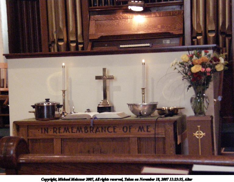 Picture #14: Altar Thumb: 384x288, 31,927 bytes (32K) Small: 768x599, 80,385 bytes (79K), (html file) Copyright, Michael Meissner 2007, All rights reserved Olympus SP-550UZ camera f/3.8, ISO 800, 1/25 sec, 14.1mm, auto mode, HQ, matrix metering, +1 sharpening 35mm equivalent focal length 85.0mm Programs used: NoiseNinja, gimp Taken by Michael Meissner on November 18, 2007 11:23:35 Last modified on November 18, 2007 at 11:23 |