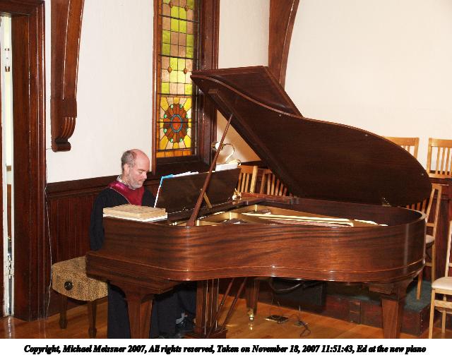 Picture #7: Ed at the new piano Thumb: 320x240, 38,393 bytes (38K) Small: 640x503, 73,069 bytes (72K), (html file) Copyright, Michael Meissner 2007, All rights reserved Olympus E-1 camera with Olympus 14-54mm f/2.8-3.5 lens f/3.1, ISO 400, FL-50 flash, 1/50 sec, 25.0mm, auto mode, SHQ, matrix metering, bias -0.3, +2 sharpening 35mm equivalent focal length 50.0mm Extra equipment used: FL-50 flash, Demb Flip-it + diffuser Programs used: gimp Taken by Michael Meissner on November 18, 2007 11:51:43 Last modified on November 18, 2007 at 20:28 |