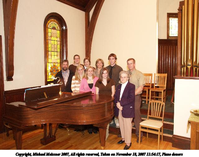 Picture #8: Piano donors Thumb: 320x240, 41,344 bytes (41K) Small: 640x503, 82,826 bytes (81K), (html file) Copyright, Michael Meissner 2007, All rights reserved Olympus E-1 camera with Olympus 14-54mm f/2.8-3.5 lens f/2.8, ISO 400, FL-50 flash, 1/30 sec, 14.0mm, auto mode, SHQ, matrix metering, bias -0.3, +2 sharpening 35mm equivalent focal length 28.0mm Extra equipment used: FL-50 flash, Demb Flip-it + diffuser Programs used: gimp Taken by Michael Meissner on November 18, 2007 11:54:13 Last modified on November 18, 2007 at 20:30 |