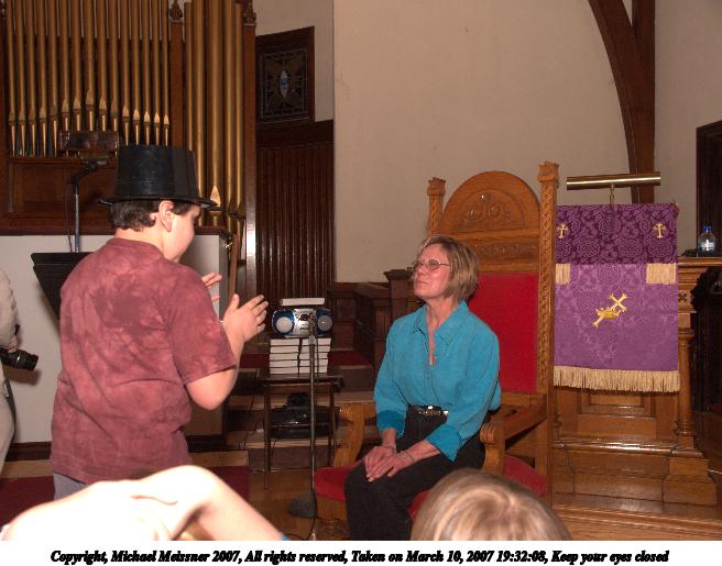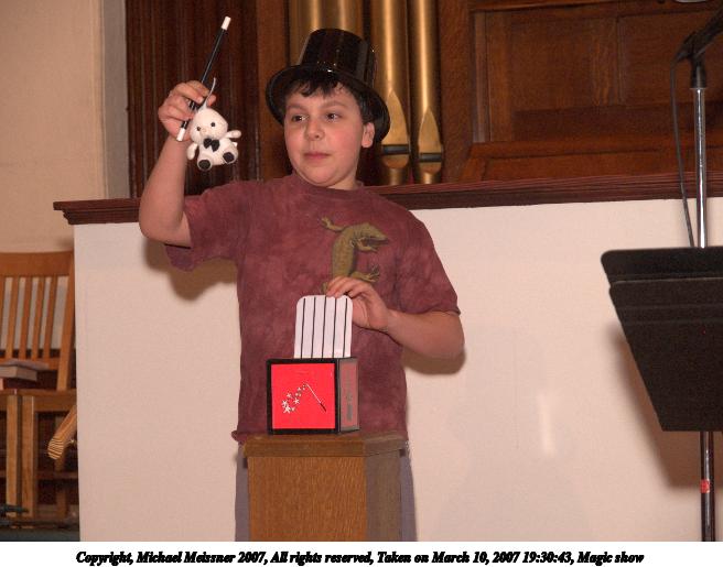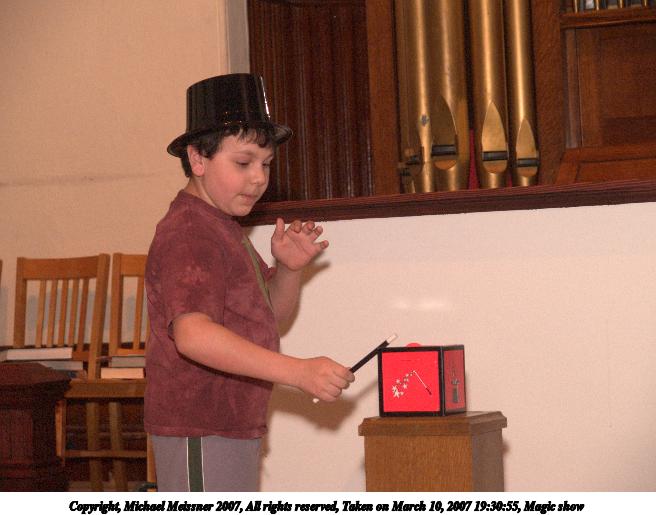 Picture #35: Magic show #2 656x515, 62,573 bytes (62K), (html file) Copyright, Michael Meissner 2007, All rights reserved Olympus E-1 camera with Olympus 14-54mm f/2.8-3.5 lens f/4.0, ISO 400, FL-50 flash, 1/125 sec, 52.0mm, manual mode, SHQ, matrix metering, +2 sharpening 35mm equivalent focal length 104.0mm Extra equipment used: FL-50 flash Programs used: adjust-time Taken by Michael Meissner on March 10, 2007 19:30:55 Last modified on March 10, 2007 at 17:30 |