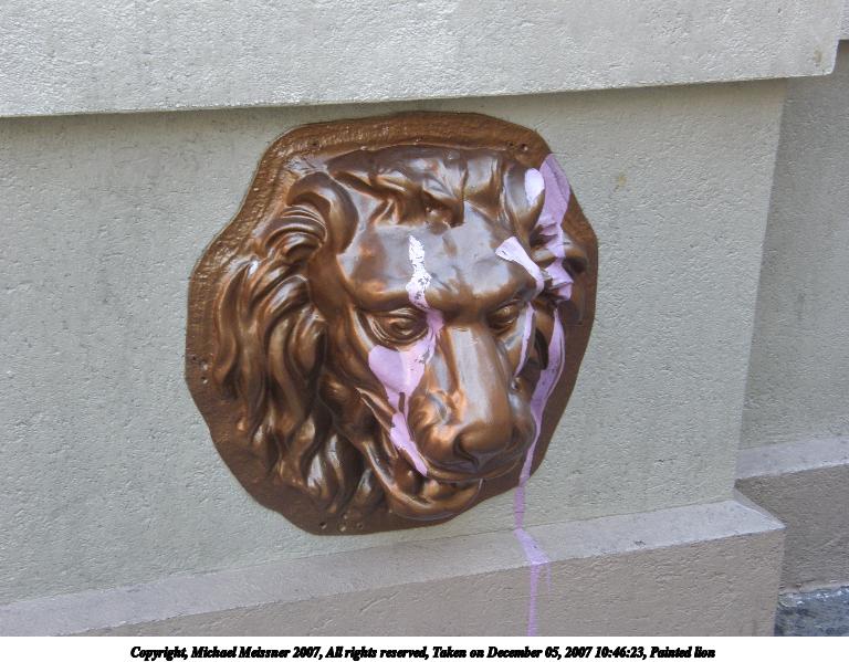 Picture #46: Painted lion 768x599, 85,397 bytes (84K), (html file) Copyright, Michael Meissner 2007, All rights reserved Olympus SP-550UZ camera f/3.9, ISO 125, 1/40 sec, 14.9mm, auto mode, HQ, matrix metering, +1 sharpening 35mm equivalent focal length 89.0mm Taken by Michael Meissner on December 05, 2007 10:46:23 Last modified on December 05, 2007 at 09:46 |