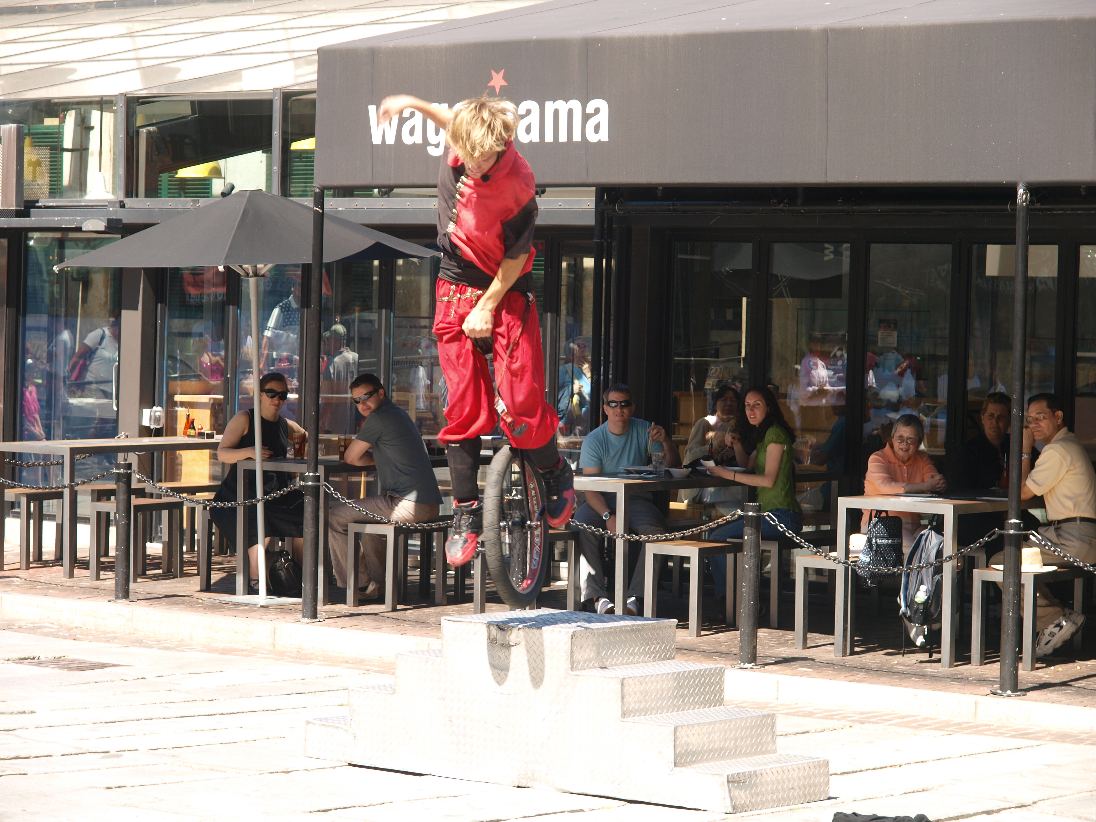 Picture #17: Unicycle Small: 912x700, 121,545 bytes (119K), (html file) Large: 3648x2736, 4,483,844 bytes (4.3M), (html file) Copyright, Michael Meissner 2008, All rights reserved Olympus E-3 camera with Olympus 14-54mm f/2.8-3.5 lens f/4.5, ISO 100, 1/200 sec, 54.0mm, auto mode, natural color, matrix metering, IS1 (All Direction Shake IS) 35mm equivalent focal length 108.0mm Taken by Michael Meissner on September 01, 2008 12:11:45 Last modified on October 16, 2008 at 21:41 |