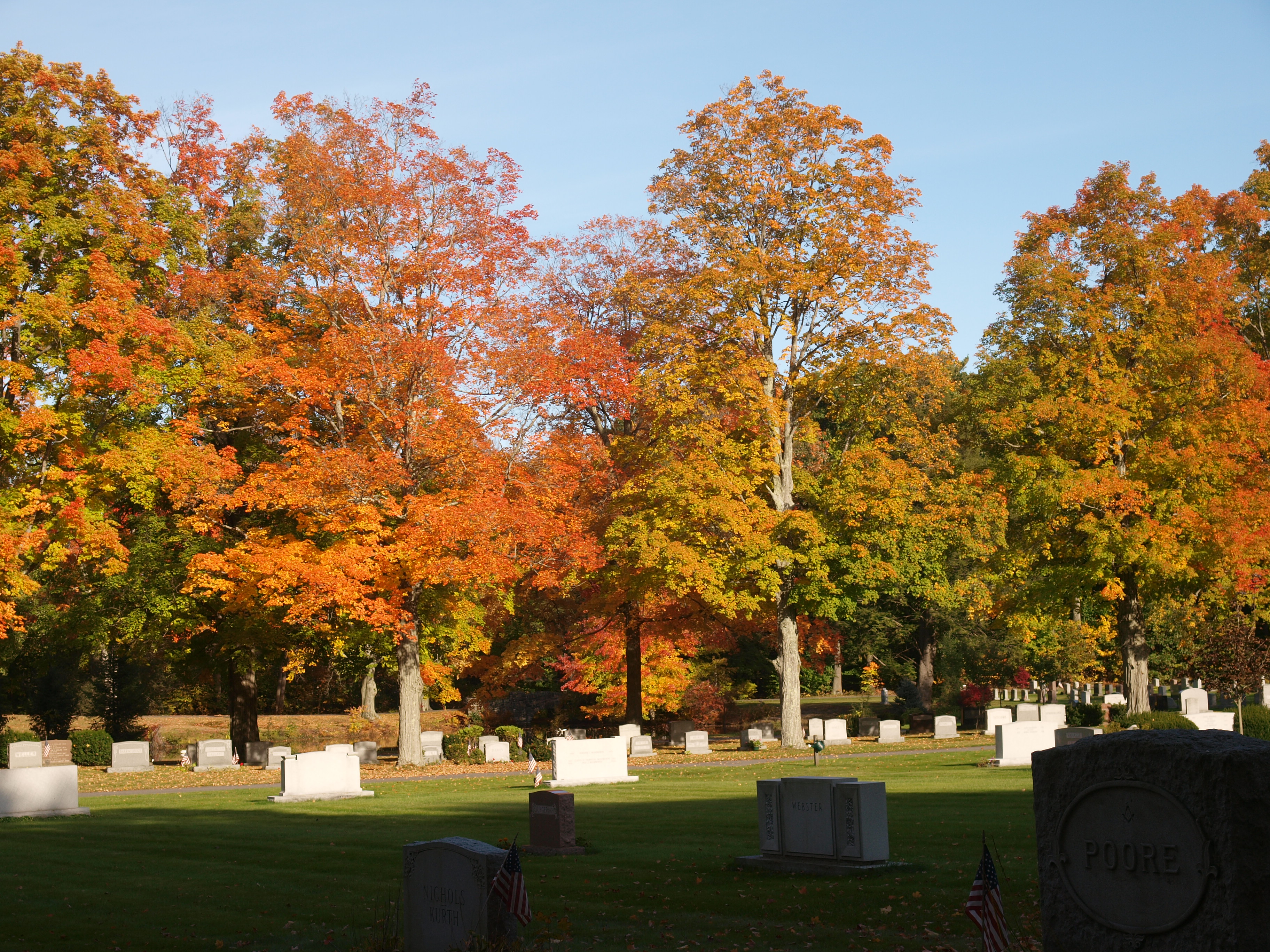 Picture #72: Andover cemetary in fall #11 Small: 912x700, 233,515 bytes (229K), (html file) Large: 3648x2736, 10,794,569 bytes (11M), (html file) Copyright, Michael Meissner 2008, All rights reserved Olympus E-3 camera with Olympus 14-54mm f/2.8-3.5 lens f/4.5, ISO 100, 1/160 sec, 27.0mm, auto mode, natural color, matrix metering, IS1 (All Direction Shake IS), exposure bracketing (shot 1) 35mm equivalent focal length 54.0mm Programs used: gimp Taken by Michael Meissner on October 18, 2008 15:35:57 Last modified on October 22, 2008 at 09:07 This picture is one of my favorites. |