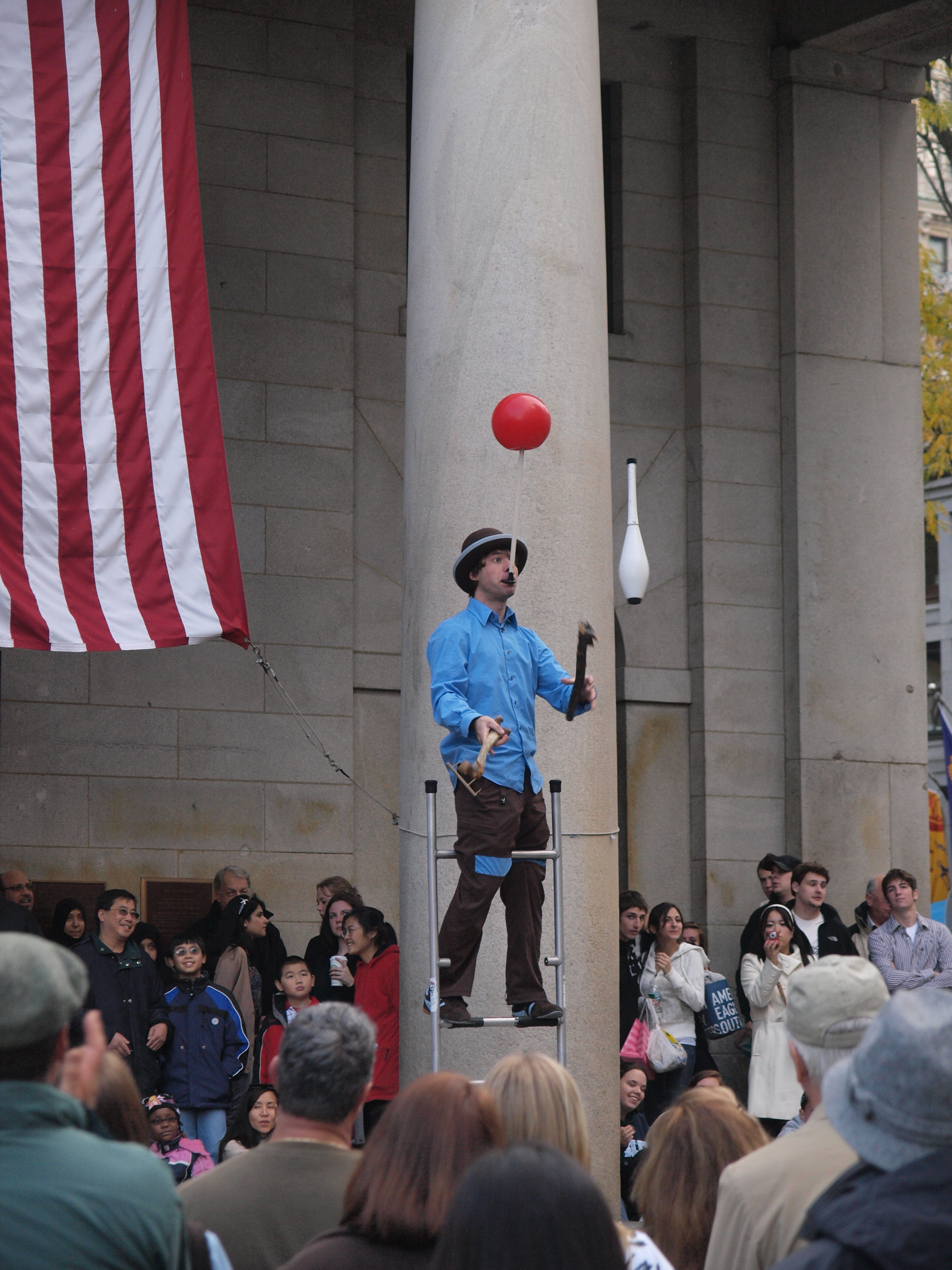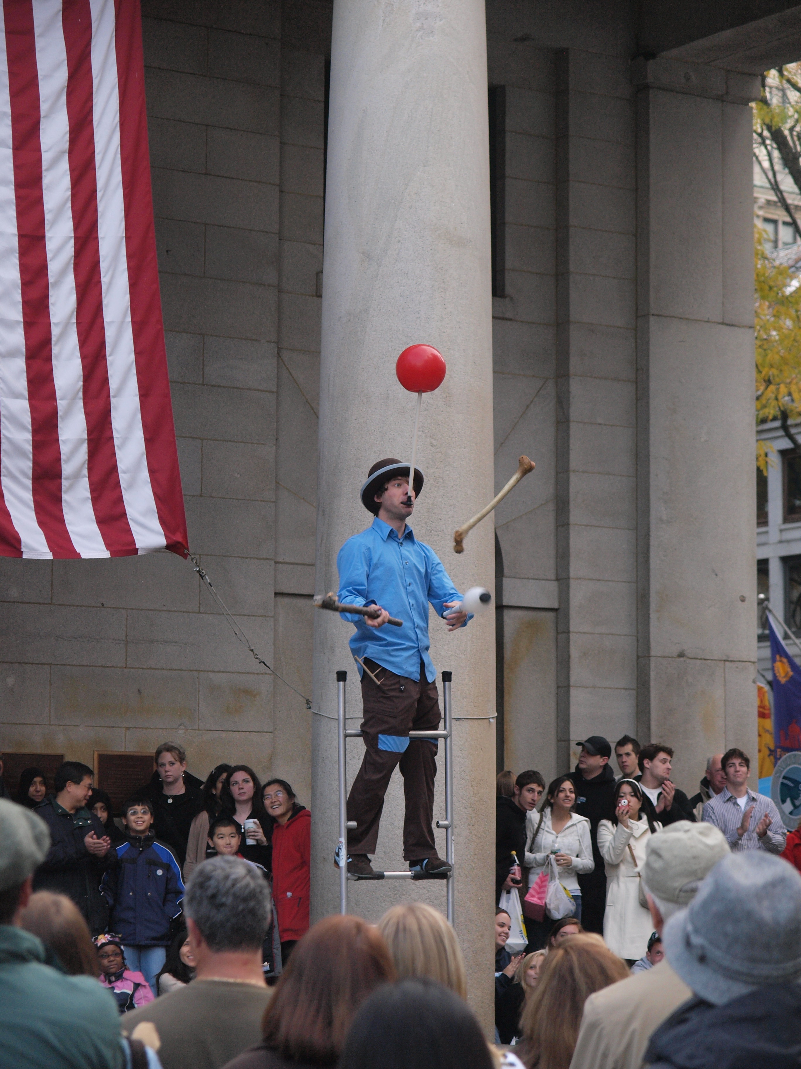 Picture #5: Juggler #2 Thumb: 342x456, 43,041 bytes (43K) Small: 684x928, 97,541 bytes (96K), (html file) Large: 2736x3648, 5,640,776 bytes (5.4M), (html file) Copyright, Michael Meissner 2008, All rights reserved Olympus E-3 camera with Olympus 14-54mm f/2.8-3.5 lens f/3.5, ISO 500, 1/250 sec, 54.0mm, shutter priority, natural color, auto gradation, matrix metering, IS1 (All Direction Shake IS) 35mm equivalent focal length 108.0mm Programs used: rotate Taken by Michael Meissner on November 01, 2008 16:25:49 Last modified on November 02, 2008 at 21:30 |