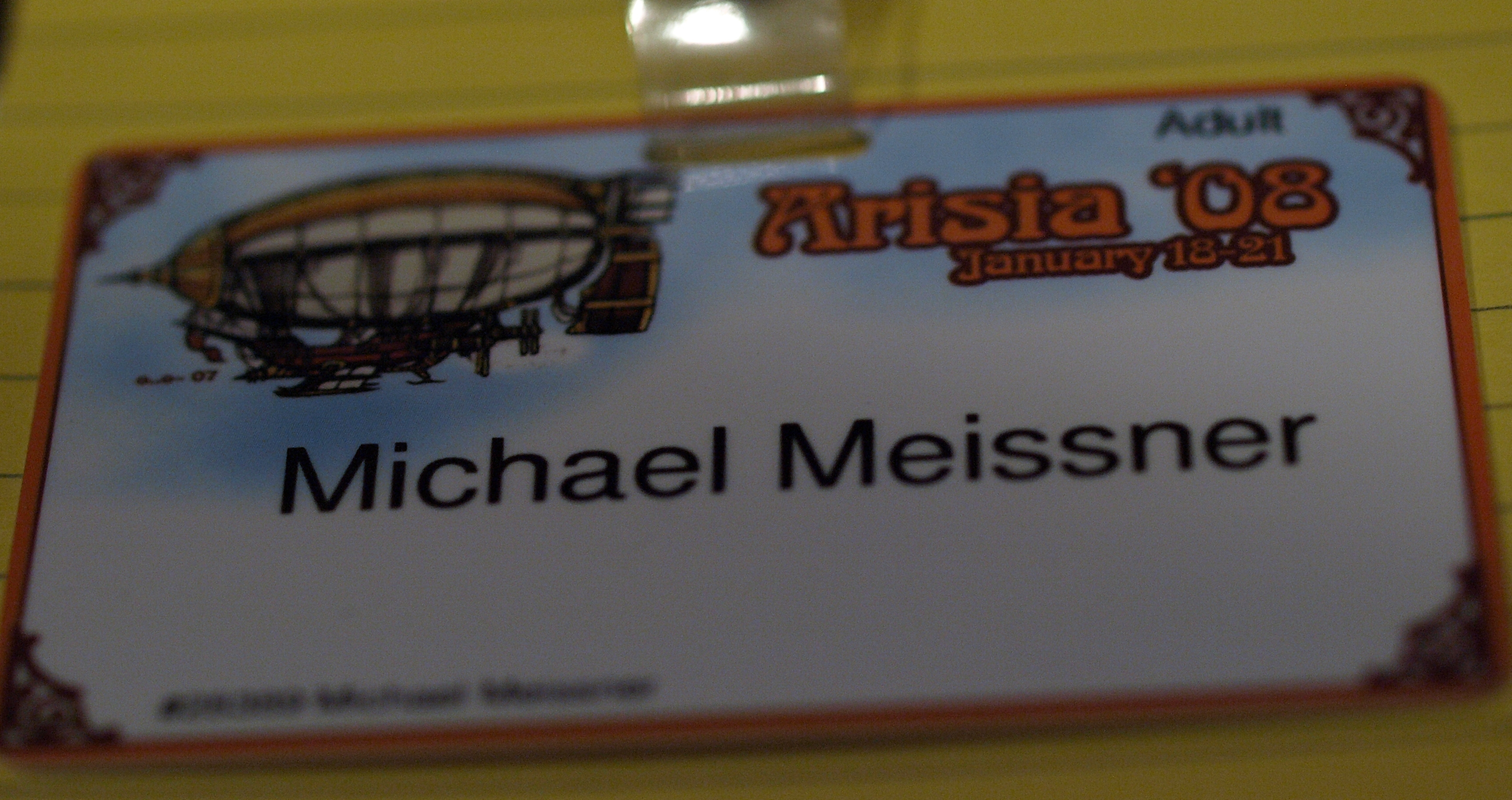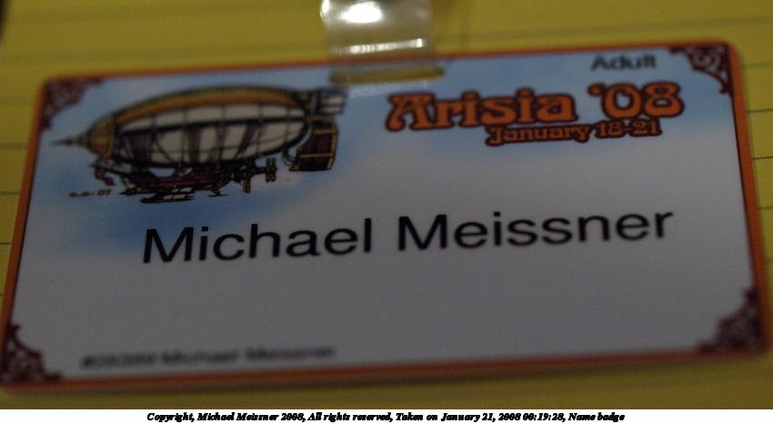 Picture #13: Name badge Small: 850x466, 59,947 bytes (59K), (html file) Large: 3400x1800, 4,658,676 bytes (4.4M), (html file) Copyright, Michael Meissner 2008, All rights reserved Olympus E-510 camera with Olympus 50mm f/2.0 lens f/2.2, ISO 800, 1/125 sec, 50.0mm, auto mode, natural color, SHQ, tungsten light (3000K), matrix metering, -1 sharpening, image stabilization, noise filter low 35mm equivalent focal length 100.0mm Programs used: gimp Taken by Michael Meissner on January 21, 2008 00:19:28 Last modified on January 21, 2008 at 00:19 |