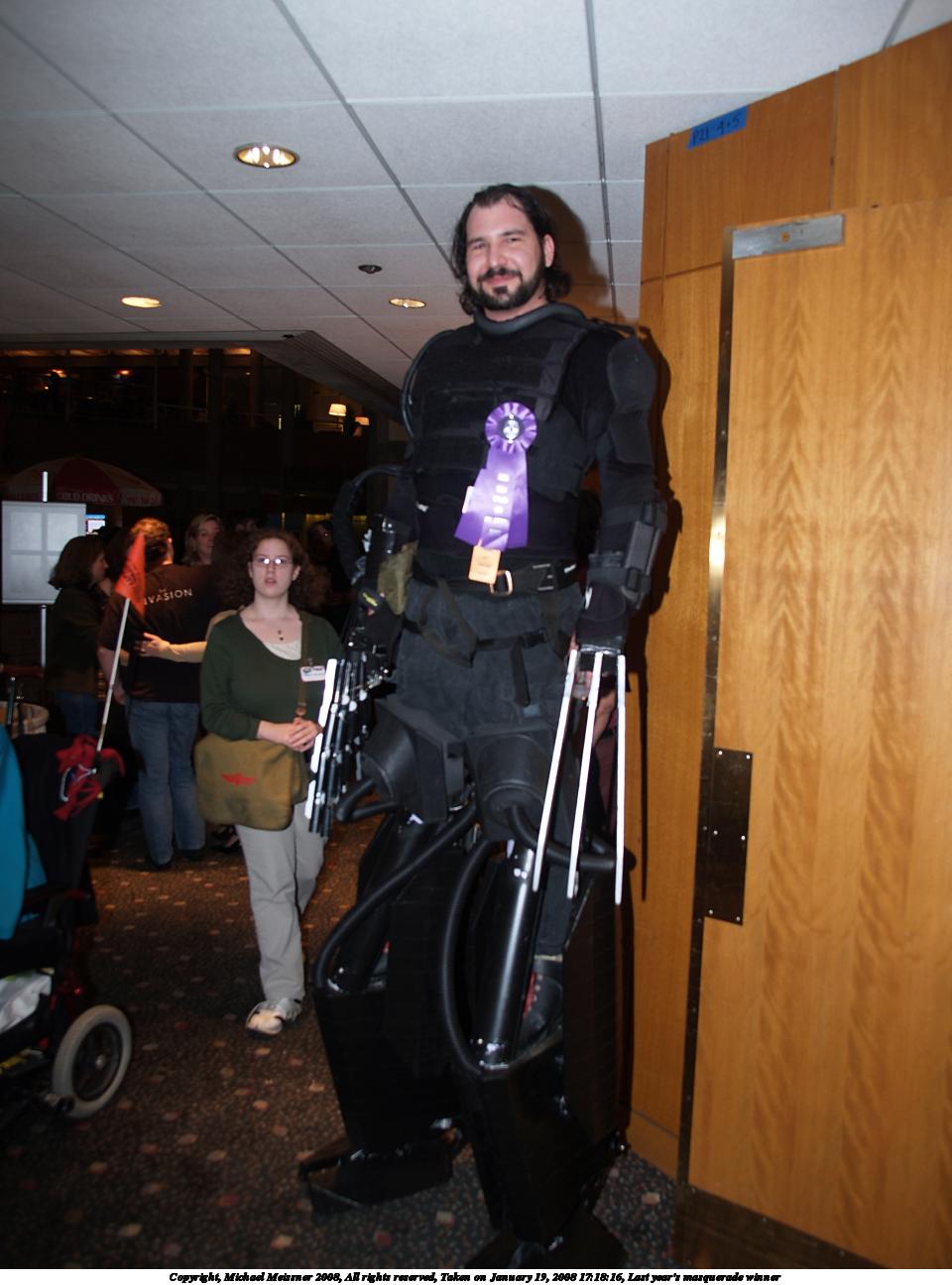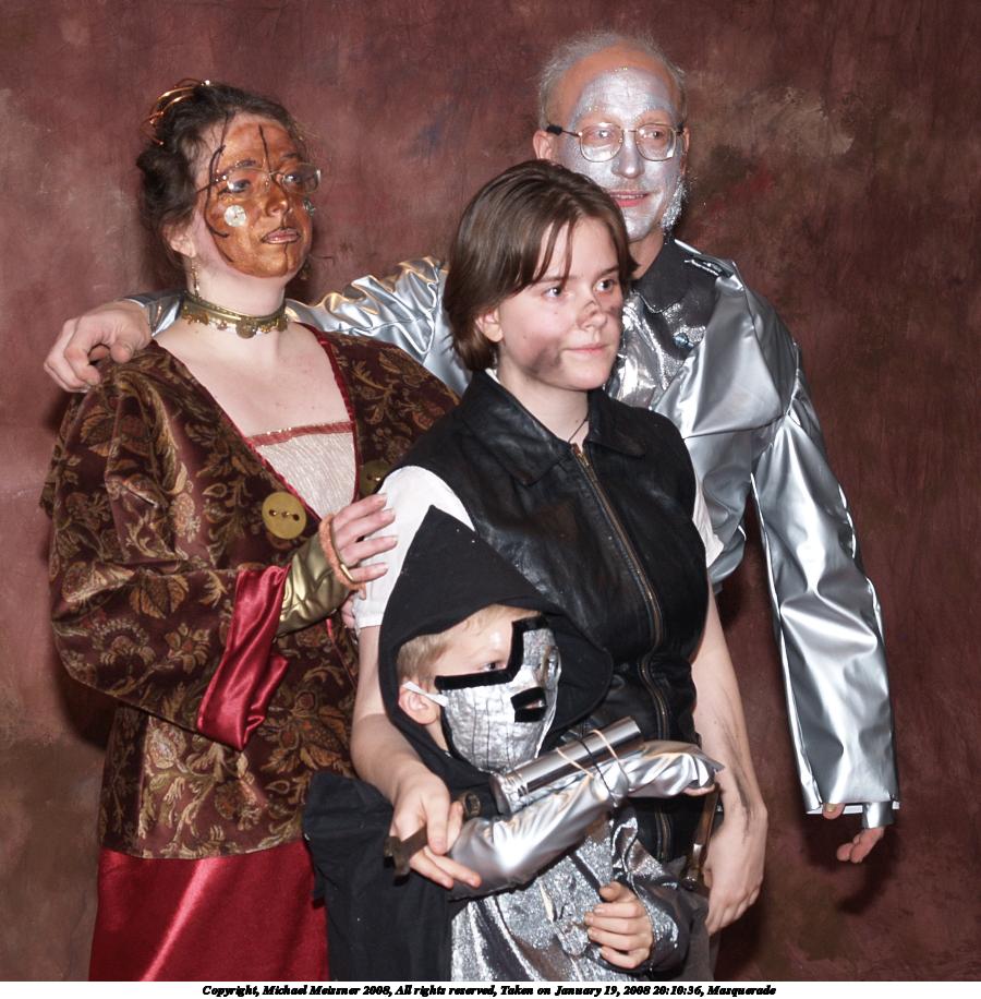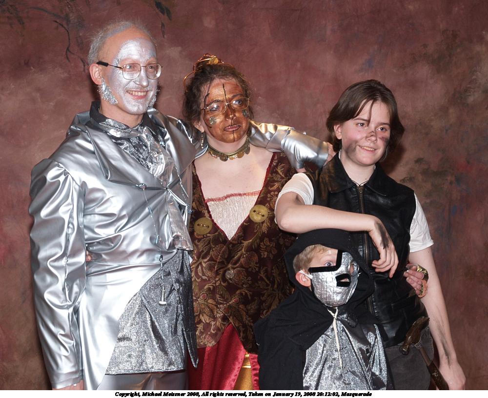 Picture #1: Last year's masquerade winner Small: 960x1296, 125,487 bytes (123K), (html file) Large: 1920x2560, 3,899,859 bytes (3.7M), (html file) Copyright, Michael Meissner 2008, All rights reserved Olympus E-1 camera with Olympus 14-54mm f/2.8-3.5 lens f/2.8, ISO 100, FL-50 flash, 1/30 sec, 14.0mm, auto mode, SHQ, matrix metering, +2 sharpening, manual focus 35mm equivalent focal length 28.0mm Extra equipment used: FL-50 flash Programs used: gimp, rotate Taken by Michael Meissner on January 19, 2008 17:18:16 Last modified on January 19, 2008 at 17:18 |