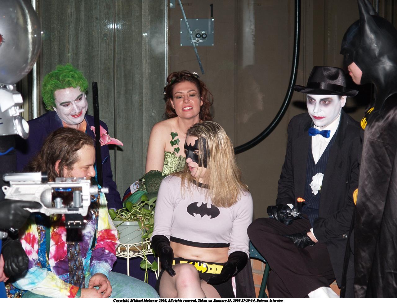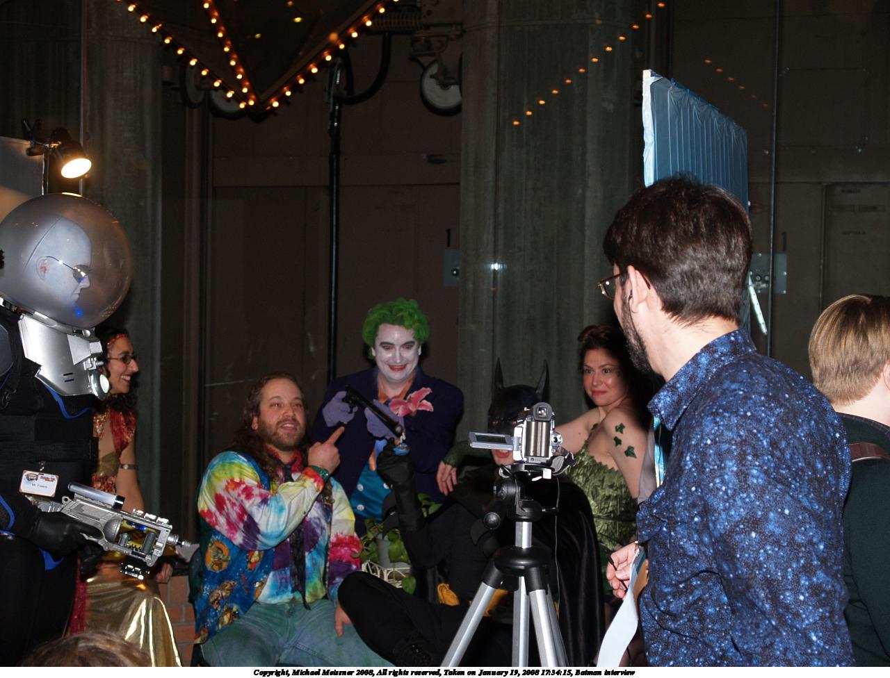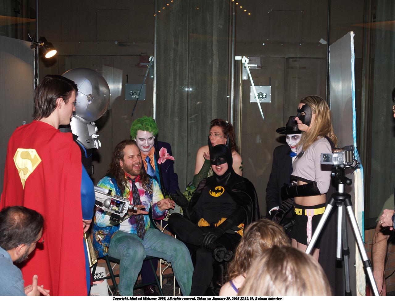 Picture #4: Batman interview #3 Small: 1280x976, 167,898 bytes (164K), (html file) Large: 2560x1920, 4,162,207 bytes (4.0M), (html file) Copyright, Michael Meissner 2008, All rights reserved Olympus E-1 camera with Olympus 14-54mm f/2.8-3.5 lens f/3.1, ISO 200, FL-50 flash, 1/50 sec, 28.0mm, auto mode, SHQ, matrix metering, +2 sharpening 35mm equivalent focal length 56.0mm Extra equipment used: FL-50 flash Programs used: gimp Taken by Michael Meissner on January 19, 2008 17:34:15 Last modified on January 19, 2008 at 17:34 |