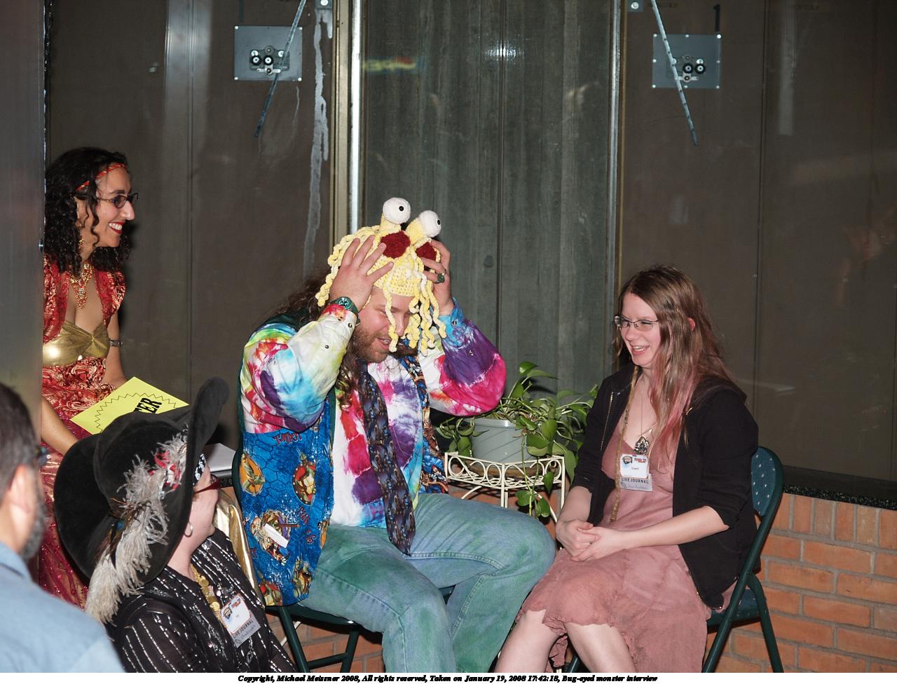Picture #7: Bug-eyed monster interview Small: 1280x976, 190,167 bytes (186K), (html file) Large: 2560x1920, 4,300,858 bytes (4.1M), (html file) Copyright, Michael Meissner 2008, All rights reserved Olympus E-1 camera with Olympus 14-54mm f/2.8-3.5 lens f/3.4, ISO 200, FL-50 flash (-0.3 flash compensation), 1/100 sec, 46.0mm, auto mode, SHQ, matrix metering, +2 sharpening 35mm equivalent focal length 92.0mm Extra equipment used: FL-50 flash Programs used: gimp Taken by Michael Meissner on January 19, 2008 17:42:18 Last modified on January 19, 2008 at 17:42 |