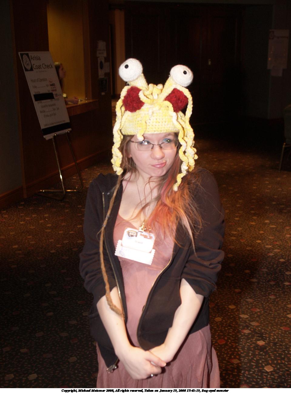 Picture #8: Bug-eyed monster Small: 960x1296, 130,324 bytes (128K), (html file) Large: 1920x2560, 4,858,522 bytes (4.6M), (html file) Copyright, Michael Meissner 2008, All rights reserved Olympus E-1 camera with Olympus 14-54mm f/2.8-3.5 lens f/3.1, ISO 200, FL-50 flash, 1/50 sec, 25.0mm, auto mode, SHQ, matrix metering, +2 sharpening 35mm equivalent focal length 50.0mm Extra equipment used: FL-50 flash Programs used: gimp, rotate Taken by Michael Meissner on January 19, 2008 17:43:19 Last modified on January 19, 2008 at 17:43 |