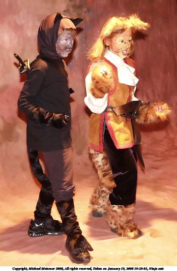 Picture #6: Ninja cats Small: 600x916, 96,927 bytes (95K), (html file) Large: 1200x1800, 1,919,946 bytes (1.8M), (html file) Copyright, Michael Meissner 2008, All rights reserved Olympus E-1 camera with Olympus 14-54mm f/2.8-3.5 lens f/3.2, ISO 1600, FL-50 flash, 1/60 sec, 33.0mm, auto mode, SHQ, matrix metering, +2 sharpening 35mm equivalent focal length 66.0mm Extra equipment used: FL-50 flash Programs used: NoiseNinja, gimp Taken by Michael Meissner on January 19, 2008 19:29:01 Last modified on February 15, 2008 at 22:09 |