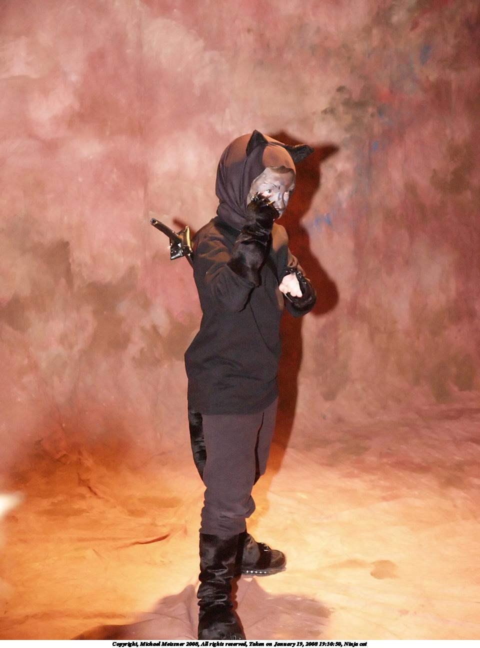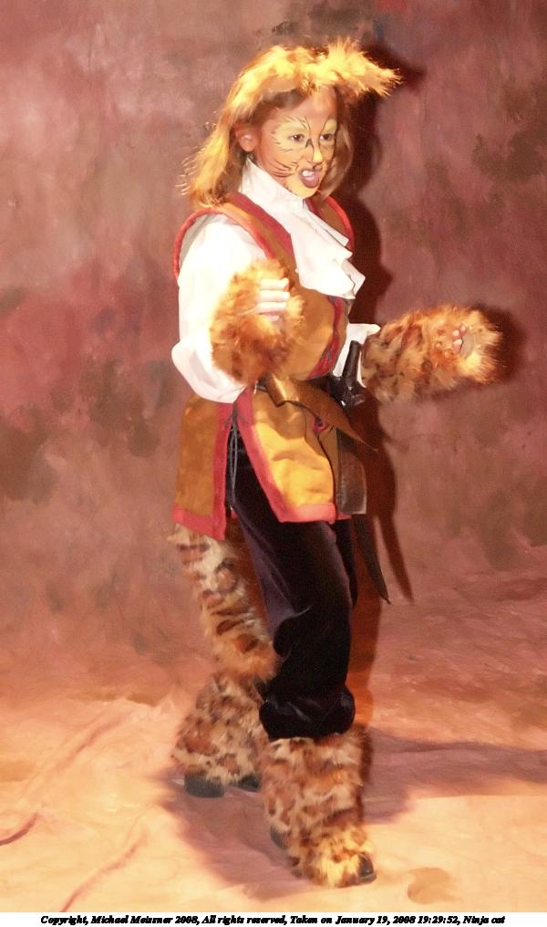 Picture #7: Ninja cat Small: 600x1016, 91,938 bytes (90K), (html file) Large: 1200x2000, 2,049,821 bytes (2.0M), (html file) Copyright, Michael Meissner 2008, All rights reserved Olympus E-1 camera with Olympus 14-54mm f/2.8-3.5 lens f/3.3, ISO 1600, FL-50 flash, 1/80 sec, 42.0mm, auto mode, SHQ, matrix metering, +2 sharpening 35mm equivalent focal length 84.0mm Extra equipment used: FL-50 flash Programs used: NoiseNinja, gimp, rotate Taken by Michael Meissner on January 19, 2008 19:29:52 Last modified on February 15, 2008 at 22:11 |