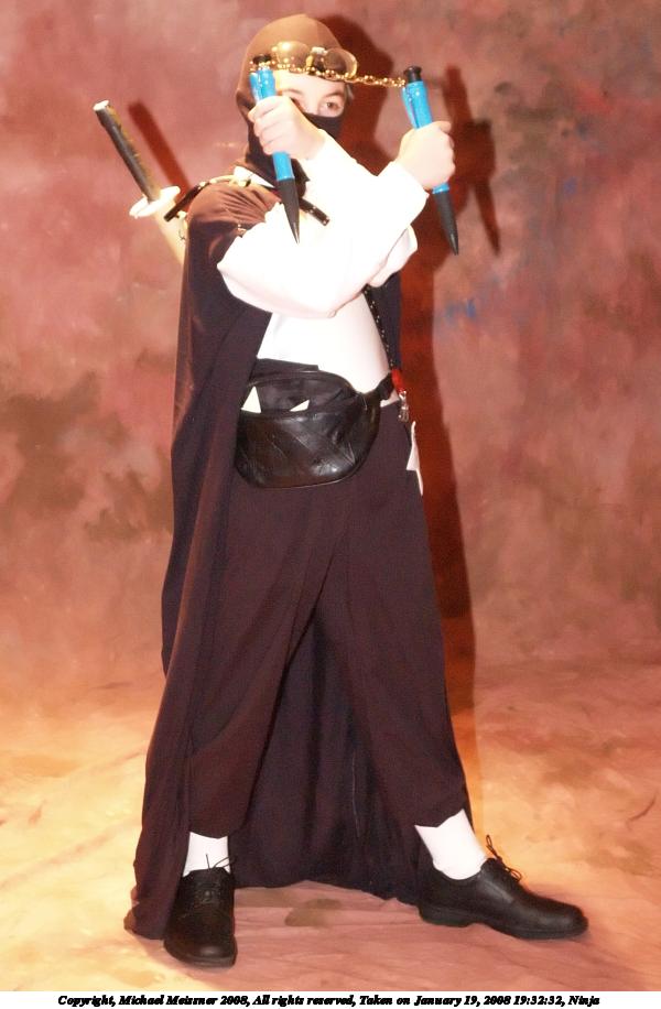 Picture #9: Ninja #2 Small: 600x916, 76,740 bytes (75K), (html file) Large: 1200x1800, 1,751,316 bytes (1.7M), (html file) Copyright, Michael Meissner 2008, All rights reserved Olympus E-1 camera with Olympus 14-54mm f/2.8-3.5 lens f/3.2, ISO 1600, FL-50 flash, 1/60 sec, 31.0mm, auto mode, SHQ, matrix metering, +2 sharpening 35mm equivalent focal length 62.0mm Extra equipment used: FL-50 flash Programs used: NoiseNinja, gimp, rotate Taken by Michael Meissner on January 19, 2008 19:32:32 Last modified on February 15, 2008 at 22:15 |