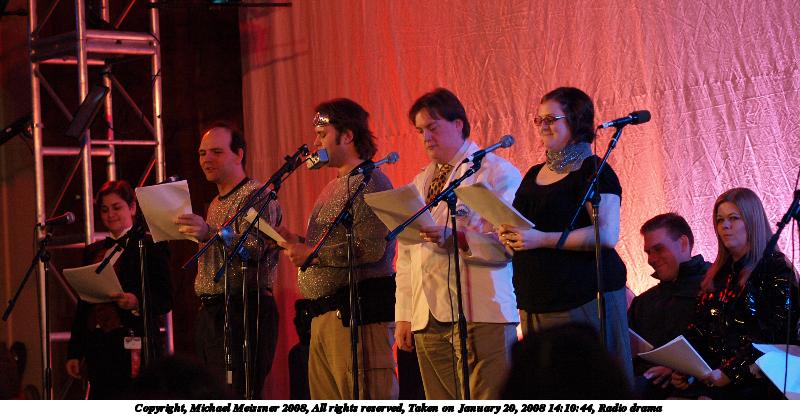Picture #12: Radio drama Small: 800x416, 93,385 bytes (92K), (html file) Large: 3200x1600, 4,467,506 bytes (4.3M), (html file) Copyright, Michael Meissner 2008, All rights reserved Olympus E-510 camera with Olympus 50mm f/2.0 lens f/2.0, ISO 800, 1/80 sec, 50.0mm, auto mode, natural color, SHQ, matrix metering, -1 sharpening, image stabilization, noise filter low 35mm equivalent focal length 100.0mm Programs used: gimp Taken by Michael Meissner on January 20, 2008 14:10:44 Last modified on January 20, 2008 at 14:10 |
