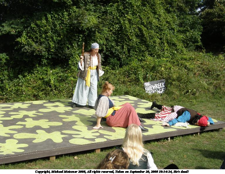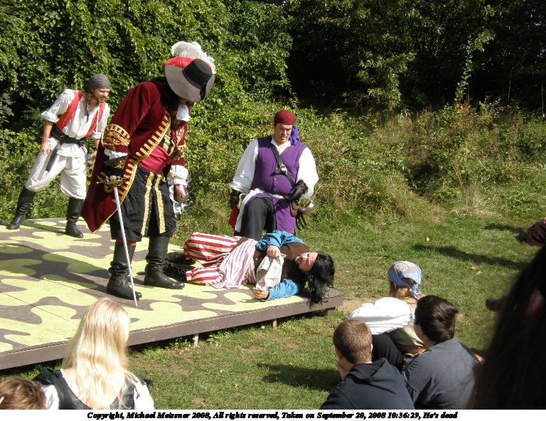 Picture #3: He's dead! Small: 768x592, 140,227 bytes (137K), (html file) Large: 3072x2304, 3,035,977 bytes (2.9M), (html file) Copyright, Michael Meissner 2008, All rights reserved Olympus SP-550UZ camera f/5.6, ISO 50, 1/160 sec, 8.6mm, auto mode, HQ, matrix metering 35mm equivalent focal length 52.0mm Taken by Michael Meissner on September 20, 2008 10:34:24 Last modified on October 22, 2008 at 08:24 |