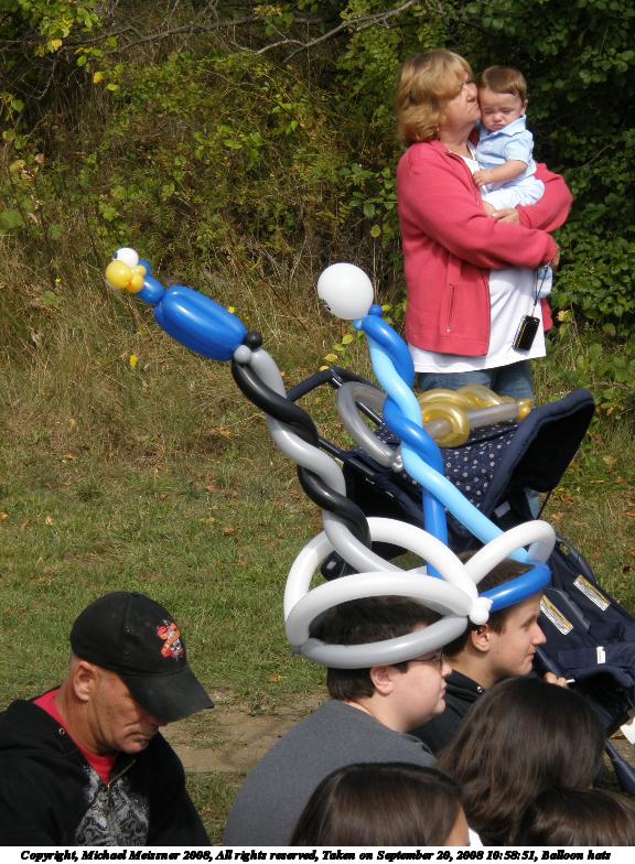 Picture #9: Balloon hats Small: 576x784, 112,610 bytes (110K), (html file) Large: 2304x3072, 4,589,528 bytes (4.4M), (html file) Copyright, Michael Meissner 2008, All rights reserved Olympus SP-550UZ camera f/5.6, ISO 50, 1/250 sec, 22.9mm, auto mode, HQ, matrix metering 35mm equivalent focal length 137.0mm Programs used: rotate Taken by Michael Meissner on September 20, 2008 10:58:51 Last modified on October 22, 2008 at 08:26 |