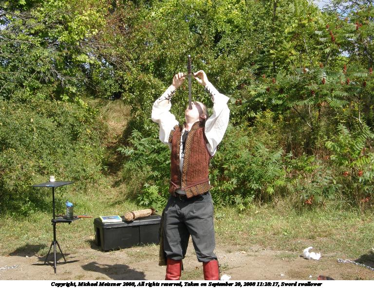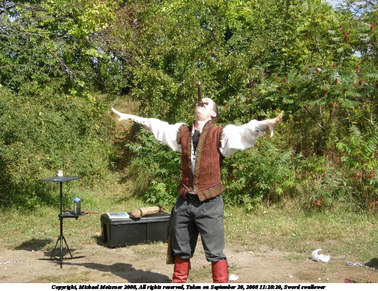 Picture #16: Sword swallower Small: 768x592, 150,363 bytes (147K), (html file) Large: 3072x2304, 3,480,937 bytes (3.3M), (html file) Copyright, Michael Meissner 2008, All rights reserved Olympus SP-550UZ camera f/5.6, ISO 50, 1/80 sec, 7.8mm, auto mode, HQ, matrix metering 35mm equivalent focal length 47.0mm Taken by Michael Meissner on September 20, 2008 11:23:20 Last modified on October 22, 2008 at 08:28 |