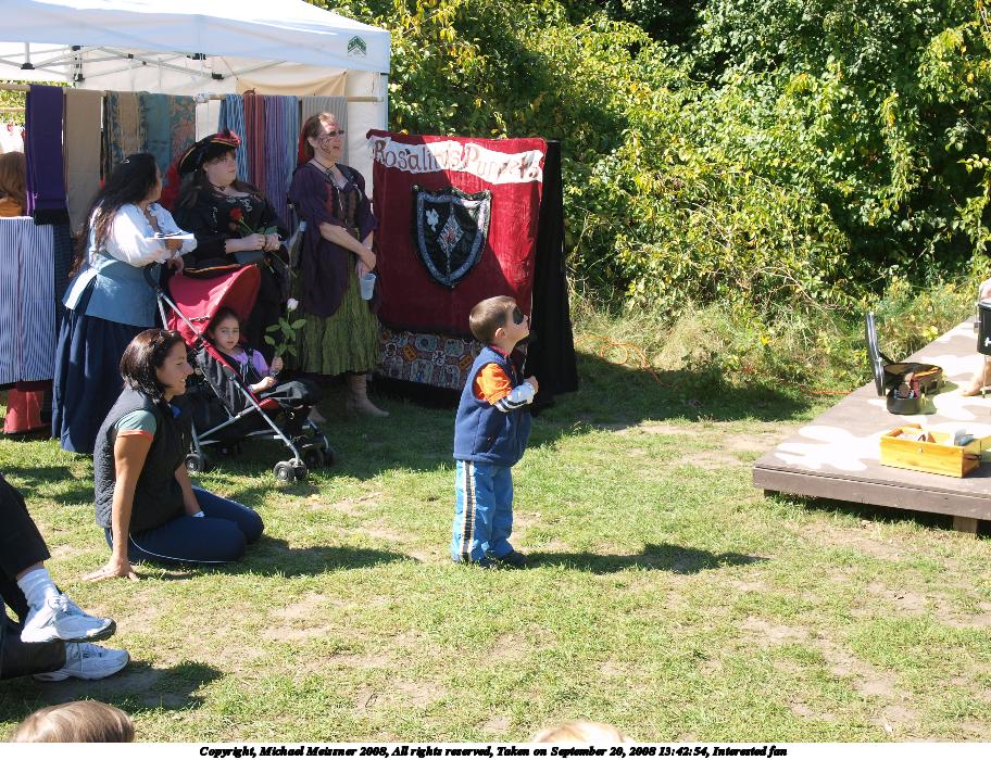 Picture #48: Interested fan Small: 912x700, 221,372 bytes (217K), (html file) Large: 3648x2736, 3,948,176 bytes (3.8M), (html file) Copyright, Michael Meissner 2008, All rights reserved Olympus E-3 camera with Olympus 14-54mm f/2.8-3.5 lens f/5.0, ISO 100, 1/160 sec, 25.0mm, auto mode, natural color, auto gradation, matrix metering, auto + manual focus, noise reduction 35mm equivalent focal length 50.0mm Taken by Michael Meissner on September 20, 2008 13:42:54 Last modified on October 22, 2008 at 08:41 |