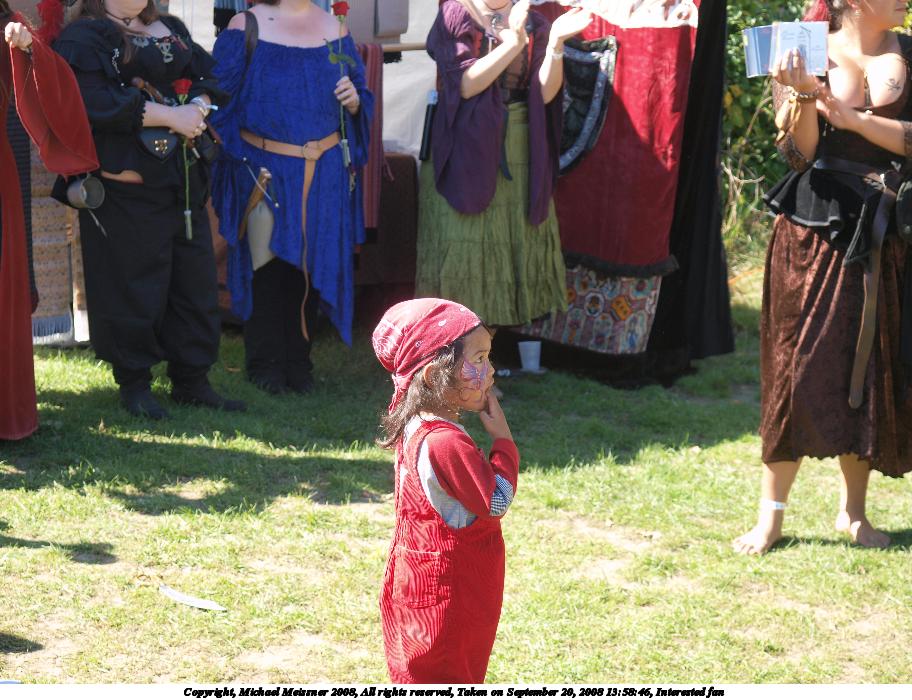 Picture #33: Face painting Small: 912x700, 142,812 bytes (140K), (html file) Large: 3648x2736, 4,874,349 bytes (4.6M), (html file) Copyright, Michael Meissner 2008, All rights reserved Olympus E-3 camera with Olympus 14-54mm f/2.8-3.5 lens f/7.1, ISO 100, 1/500 sec, 54.0mm, auto mode, natural color, auto gradation, matrix metering, auto + manual focus, noise reduction 35mm equivalent focal length 108.0mm Taken by Michael Meissner on September 20, 2008 13:07:15 Last modified on October 22, 2008 at 08:35 |