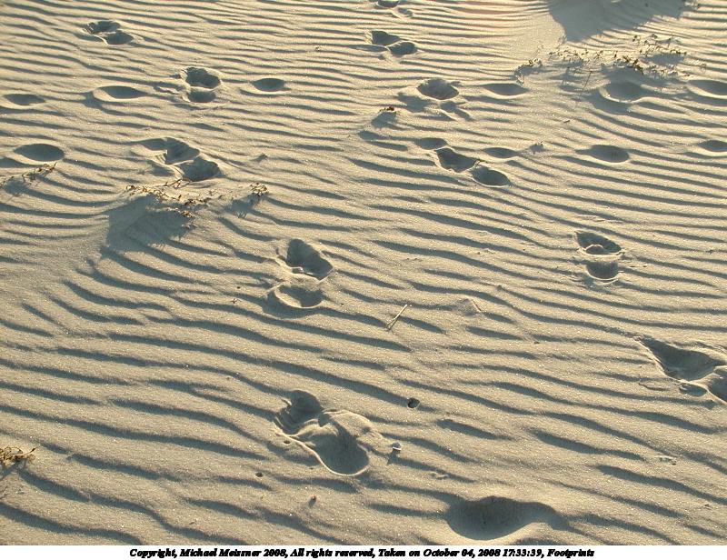 Picture #140: Footprints 800x616, 141,136 bytes (138K), (html file) Copyright, Michael Meissner 2008, All rights reserved Olympus C-2100UZ camera f/3.5, ISO 100, 1/650 sec, 12.7mm, auto mode, SHQ, cloudy, matrix metering 35mm equivalent focal length 70.0mm Taken by Michael Meissner on October 04, 2008 17:33:39 Last modified on October 17, 2008 at 07:27 |