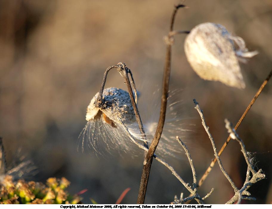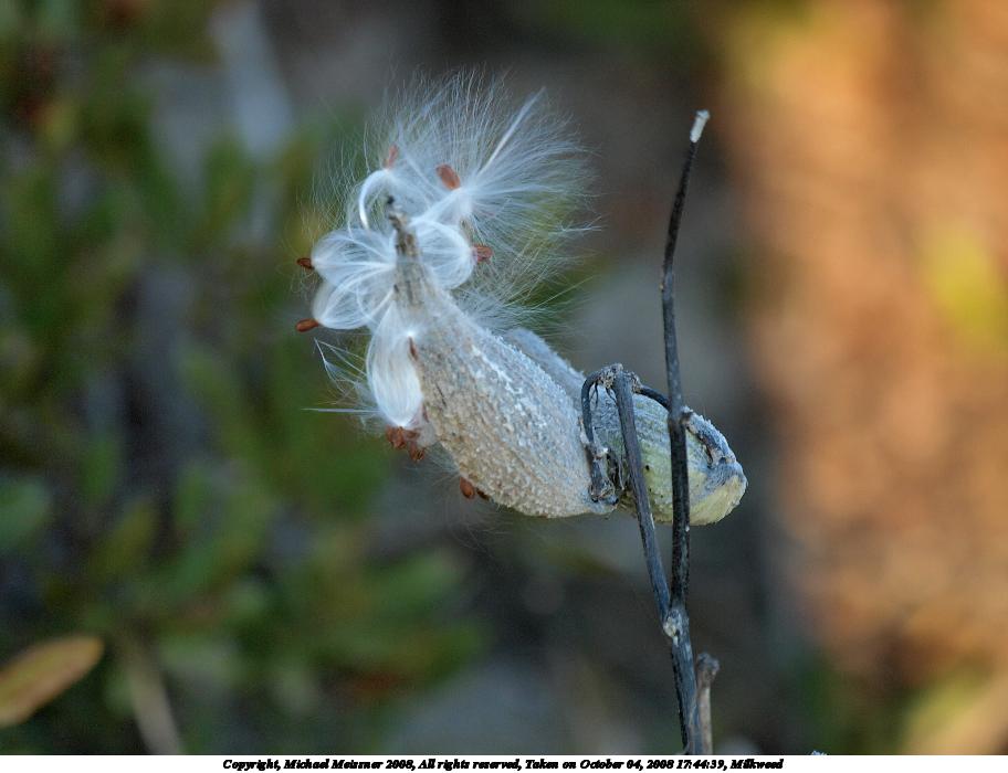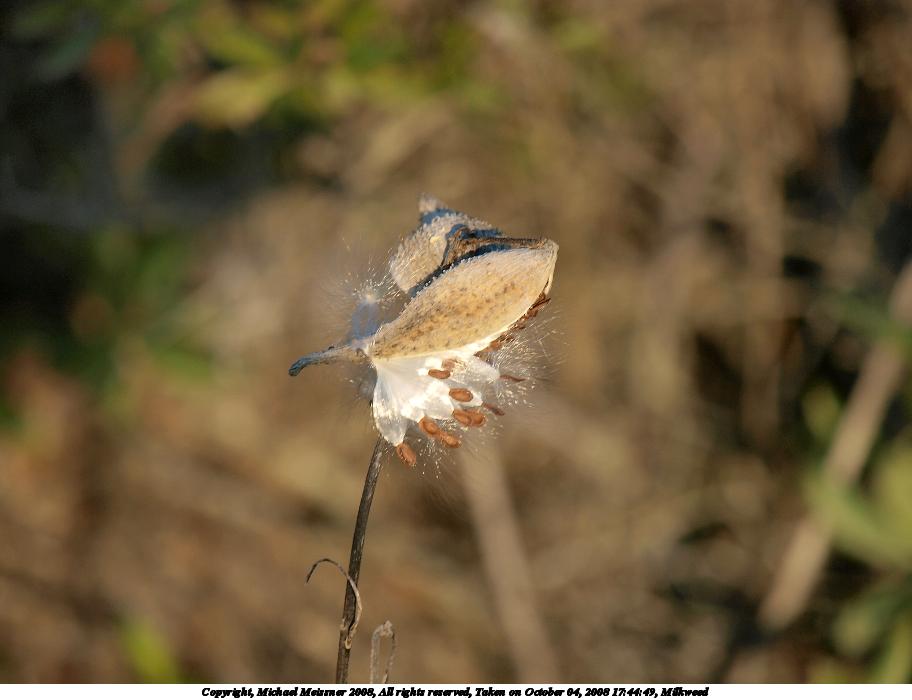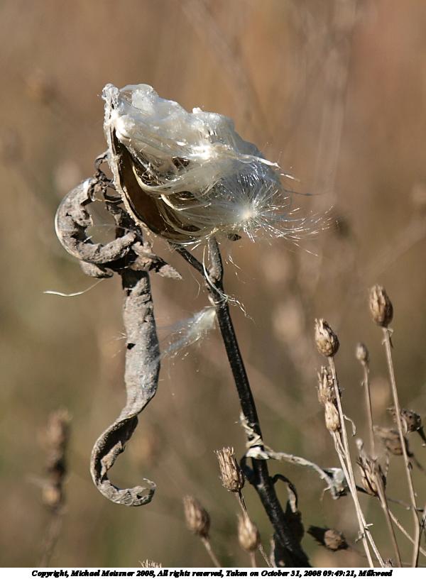Picture #3: Milkweed #6 600x816, 70,909 bytes (70K), (html file) Copyright, Michael Meissner 2008, All rights reserved Olympus E-3 camera with Olympus 50-200mm f/2.8-3.5 lens f/4.5, ISO 100, 1/500 sec, 200.0mm, auto mode, natural color, auto gradation, matrix metering, IS1 (All Direction Shake IS) 35mm equivalent focal length 401.0mm Programs used: gimp Taken by Michael Meissner on October 31, 2008 09:49:21 Last modified on November 02, 2008 at 07:48 |