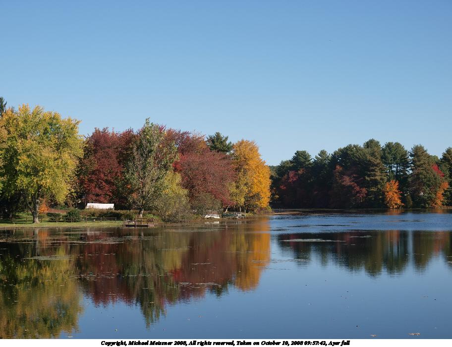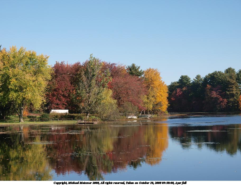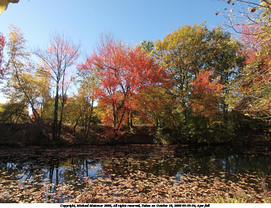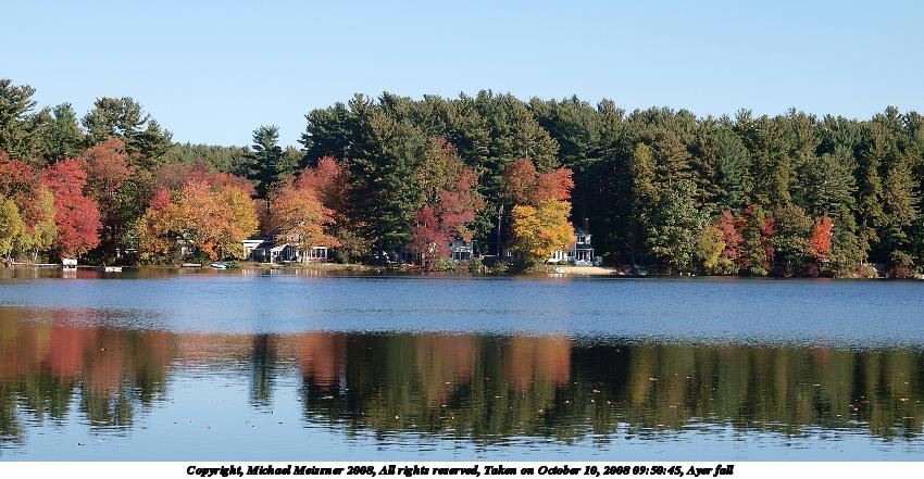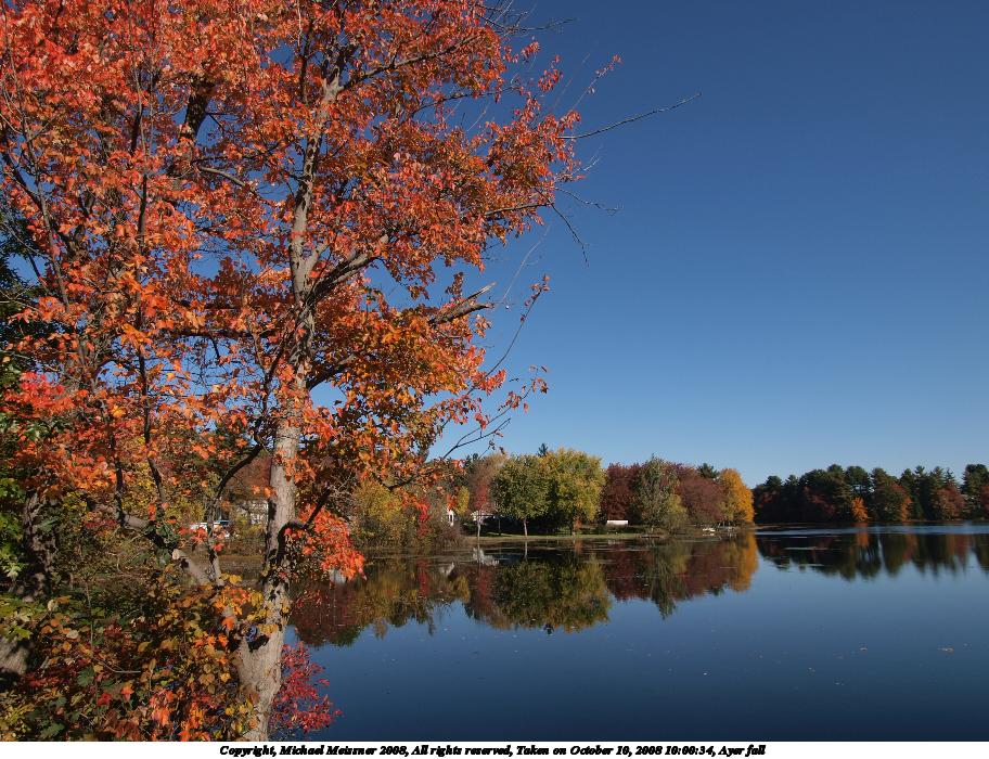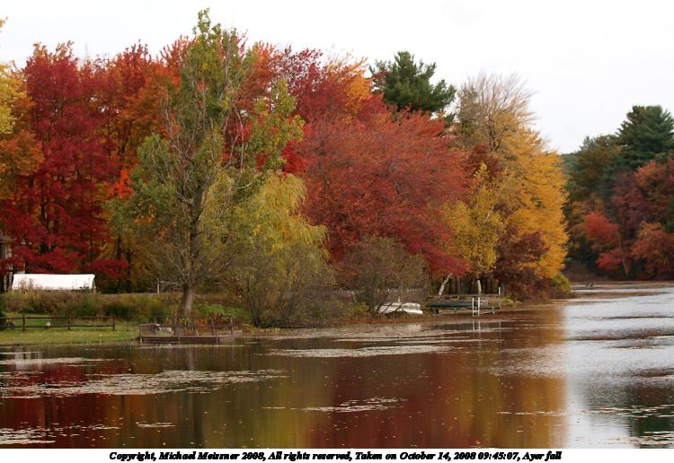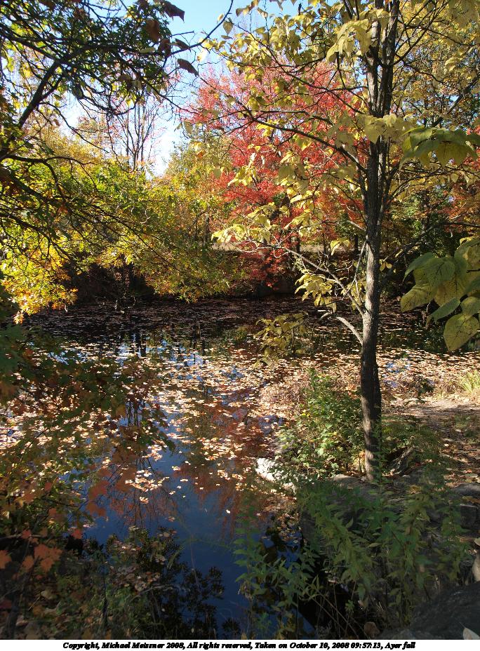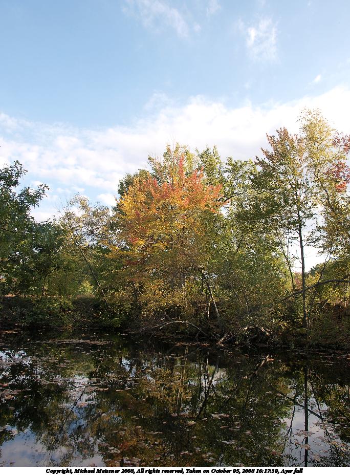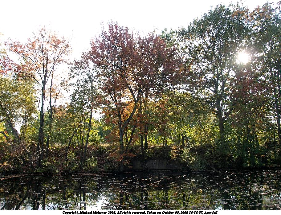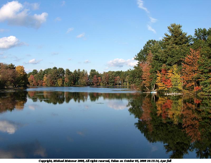 Picture #122: Ayer fall #2 800x616, 112,679 bytes (111K), (html file) Copyright, Michael Meissner 2008, All rights reserved Olympus E-3 camera with Olympus 14-54mm f/2.8-3.5 lens f/6.3, ISO 100, 1/400 sec, 17.0mm, auto mode, natural color, auto gradation, matrix metering 35mm equivalent focal length 34.0mm Programs used: gimp Taken by Michael Meissner on October 05, 2008 16:15:14 Last modified on October 17, 2008 at 08:01 This picture is one of my favorites. |