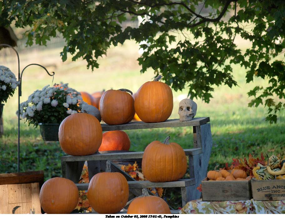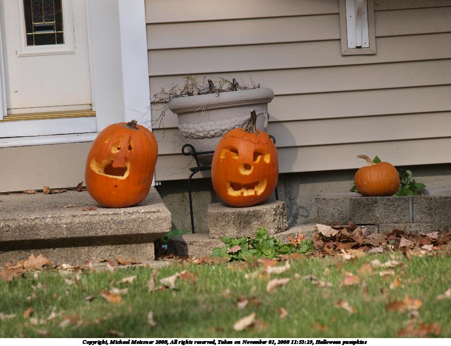 Picture #19: Halloween pumpkins #2 912x700, 198,971 bytes (195K), (html file) Copyright, Michael Meissner 2008, All rights reserved Olympus E-3 camera with Olympus 50-200mm f/2.8-3.5 lens f/5.0, ISO 100, 1/400 sec, 60.0mm, auto mode, natural color, auto gradation, matrix metering, IS1 (All Direction Shake IS) 35mm equivalent focal length 120.0mm Taken by Michael Meissner on October 31, 2008 15:12:49 Last modified on October 31, 2008 at 23:58 |