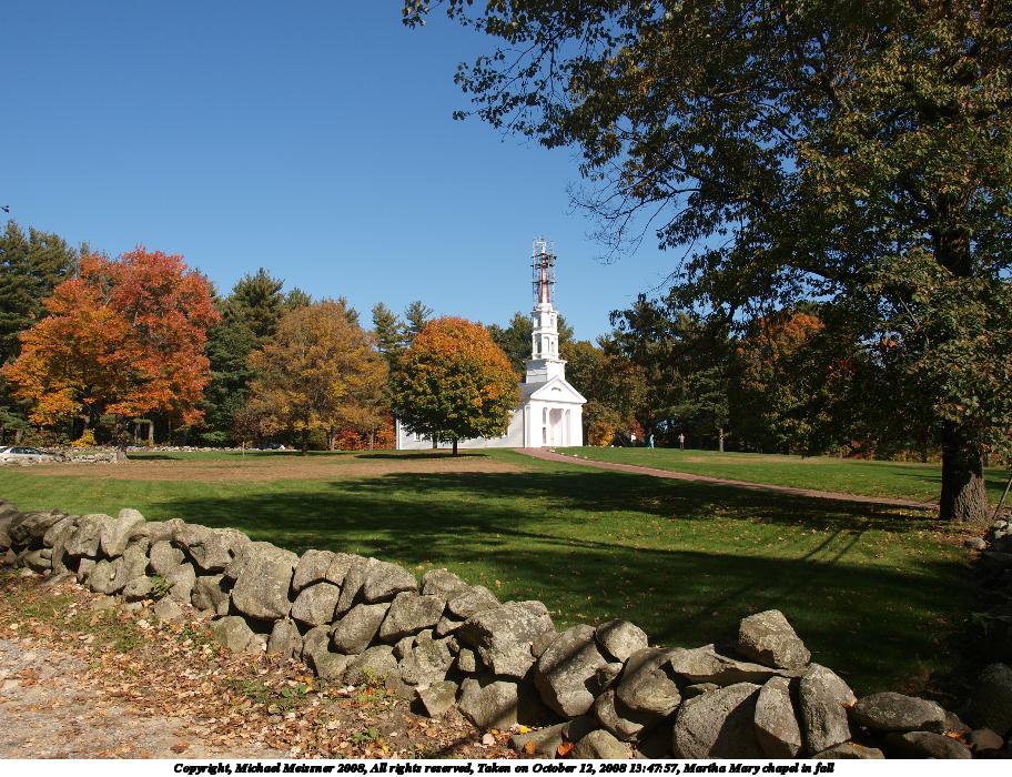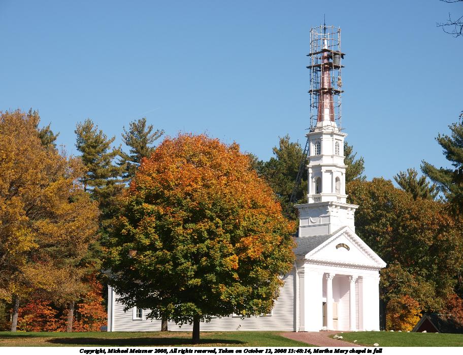 Picture #84: Martha Mary chapel in fall #2 912x700, 176,498 bytes (173K), (html file) Copyright, Michael Meissner 2008, All rights reserved Olympus E-3 camera with Olympus 14-54mm f/2.8-3.5 lens f/6.3, ISO 100, 1/320 sec, 46.0mm, auto mode, natural color, matrix metering 35mm equivalent focal length 92.0mm Taken by Michael Meissner on October 12, 2008 13:48:14 Last modified on October 18, 2008 at 00:03 |