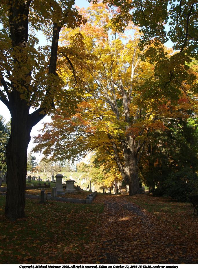 Picture #75: Andover cemetary in fall #2 912x700, 212,322 bytes (208K), (html file) Copyright, Michael Meissner 2008, All rights reserved Olympus E-3 camera with Olympus 14-54mm f/2.8-3.5 lens f/5.6, ISO 100, 1/250 sec, 32.0mm, auto mode, natural color, matrix metering 35mm equivalent focal length 64.0mm Taken by Michael Meissner on October 12, 2008 15:57:59 Last modified on October 18, 2008 at 08:56 |