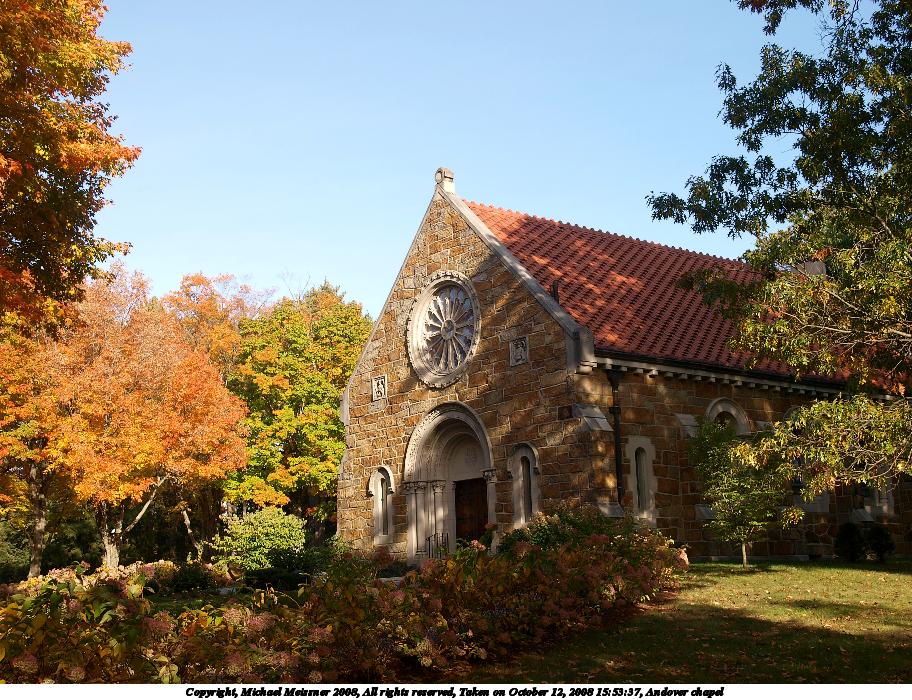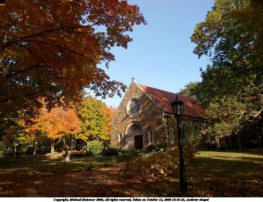 Picture #77: Andover chapel #2 912x700, 213,959 bytes (209K), (html file) Copyright, Michael Meissner 2008, All rights reserved Olympus E-3 camera with Olympus 14-54mm f/2.8-3.5 lens f/5.0, ISO 100, 1/200 sec, 22.0mm, auto mode, natural color, matrix metering 35mm equivalent focal length 44.0mm Programs used: gimp Taken by Michael Meissner on October 12, 2008 15:53:37 Last modified on October 18, 2008 at 00:10 This picture is one of my favorites. |