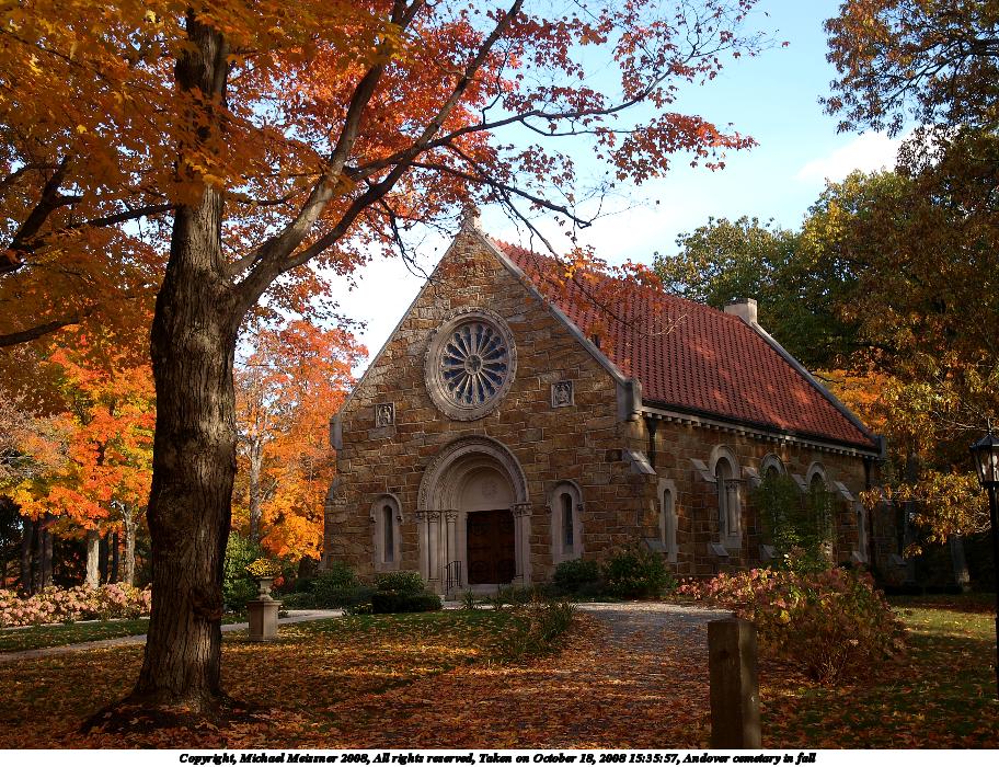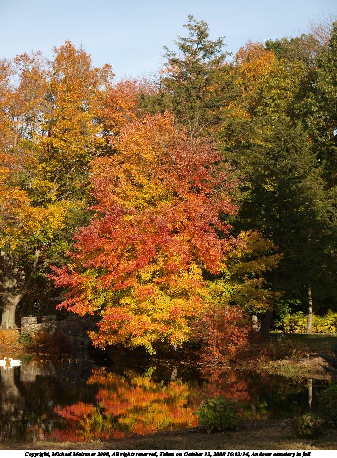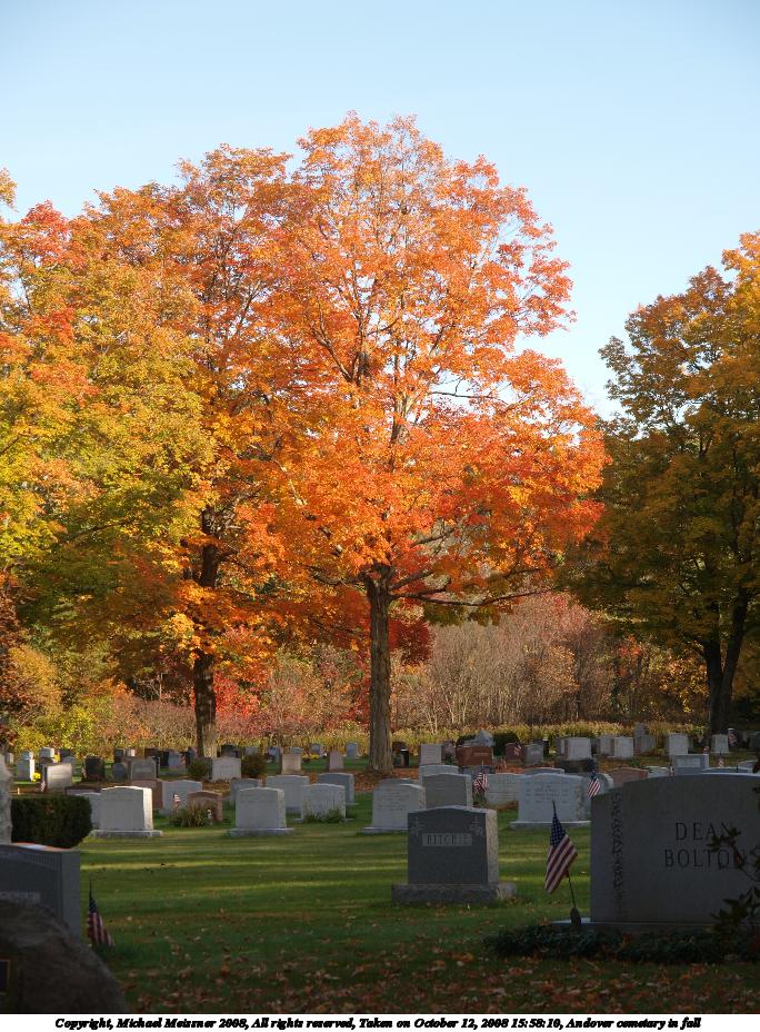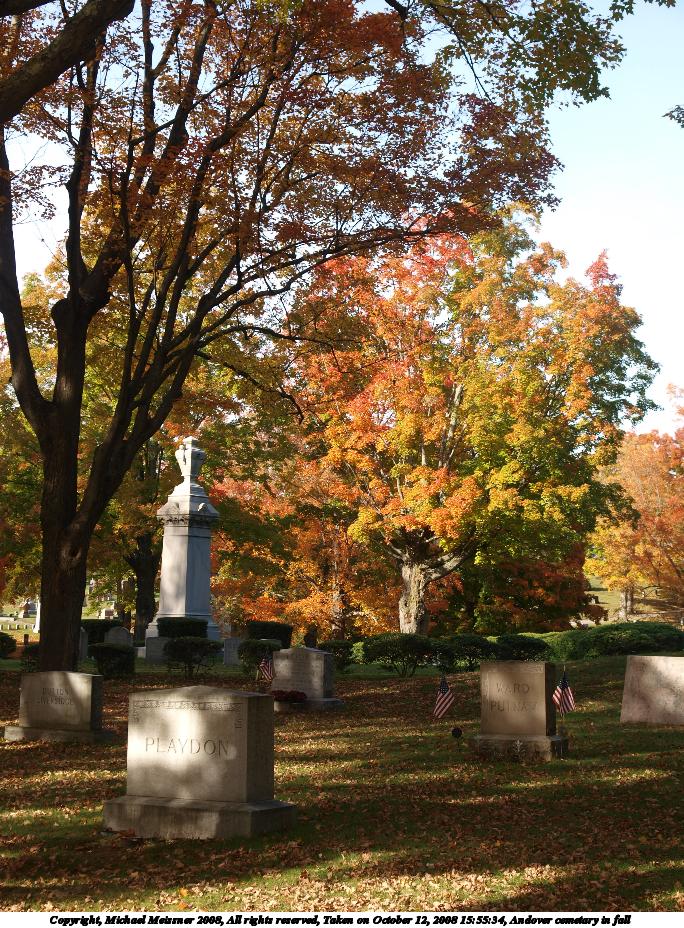 Picture #73: Andover cemetary in fall #4 912x700, 236,200 bytes (231K), (html file) Copyright, Michael Meissner 2008, All rights reserved Olympus E-3 camera with Olympus 14-54mm f/2.8-3.5 lens f/5.0, ISO 100, 1/200 sec, 28.0mm, auto mode, natural color, matrix metering 35mm equivalent focal length 56.0mm Programs used: gimp Taken by Michael Meissner on October 12, 2008 16:01:46 Last modified on October 18, 2008 at 09:00 This picture is one of my favorites. |